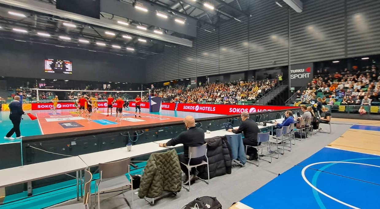 Kupittaan palloiluhalli ja yli 1400 katsojaa on paikalla seuraamassa lentopallon Suomen cupin miesten finaaliottelua. Ylen TV-studio asiantuntijoineenkin ovat paikalla. TV-kamerat ovat valmiina välittämään kiihkeitä tunnelmia