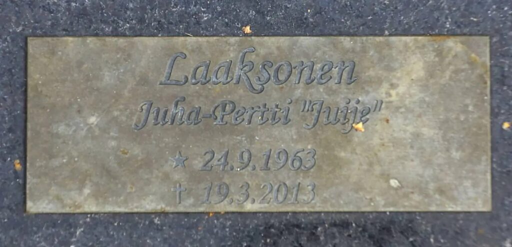 Laaksonen on haudattu Kim Suomisen ja Tomi Jalon tavoin Turun hautausmaalle. Juijen viimeistä leposijaa on vaikea löytää, sillä sukuhaudan ohessa on vain pieni ja vaatimaton muistolaatta: Juha-Pertti ”Juije” Laaksonen 24.9.1963 – 19.3.2013.