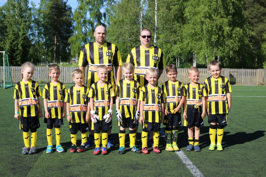 Tänään on harjoitusten ohessa myös joukkuekuvaus suuren maailman tyyliin. Liedon pohjoisosan noin tuhannen asukkaan kylän pikkupojat ovat kokoontuneet Pahkamäen koulun kentälle. Ja mikä on ottaa joukkuekuvia, kun pelaajien yllä ovat upouudet pelipaidat sponsorin logolla koristeltuna. Peliasun väri, mustakeltainen, on tietysti esikuvan, AIK:n, värien mukainen.