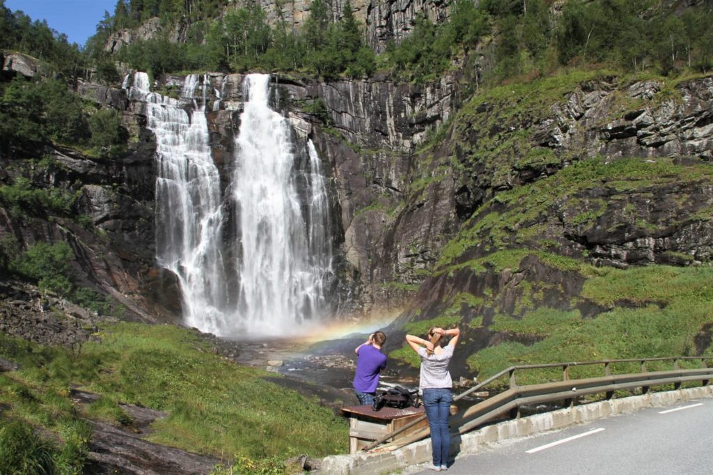 Bergenistä johtavaa maisematietä pitkin ajaa runsaassa tunnissa Hardangervuonon maisemiin. Ensimmäinen pysähdyspaikka on vuonon pohjoisrannalla, lähellä Norheimsundia. Tienvarsiviitat opastavat Steindalsfossen-putouksen luo. Se sijaitsee lähes tien vieressä. Putouskorkeus ei ole Hardangerin alueen suurin. Silti 20 metrin korkeudesta alas syöksyvä vesi tekee vaikutuksen. Steindalsfossen on valittu yhdeksi Norjan kauneimmaksi putoukseksi. Kohteen erikoisuutena on mahdollisuus kävellä putouksen vesiverhon taakse, jossa meteli on kovimmillaan.
