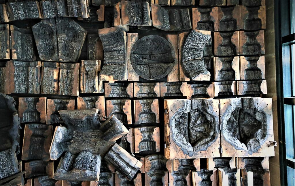 Lasimuseon tunnelmallisessa valaistuksessa vitriineihin sijoitetut esineet tulevat kauniisti esille. Eräs seinistä on hätkähdyttävä. Se muodostuu Sarpanevan Finlandia-maljakon valmistuksessa käytetyistä hiiltyneistä tervalepistä tehdyistä puumuoteista. Jokainen maljakko oli uniikkituote.