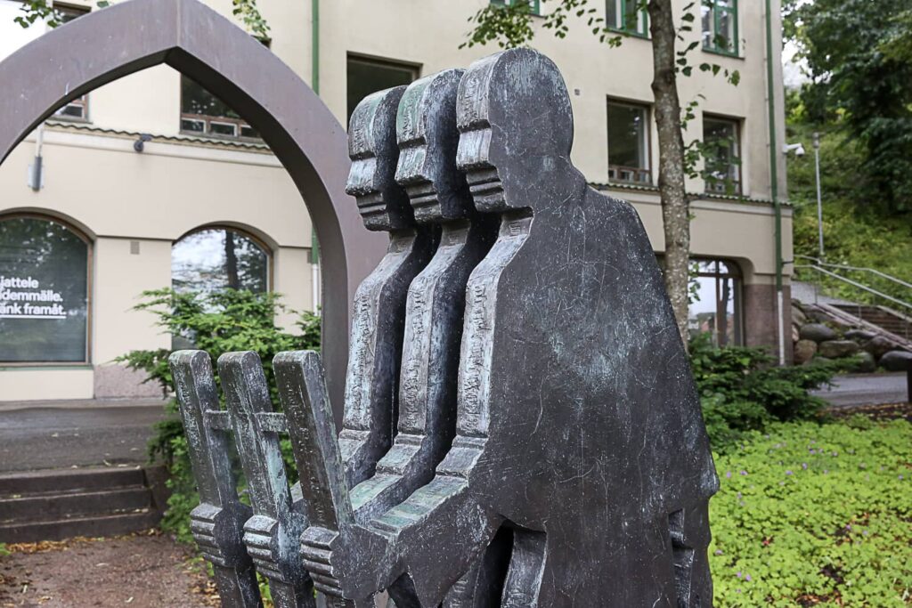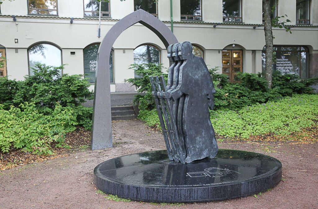 Olavinpuiston Dominikaaniluostarin säänkestävä muistomerkki muodostuu kolmesta sauvat käsissään eteenpäin askeltavista dominikaanimunkeista. Suippokärkinen messinkiportti symboloi luostarin ovea.