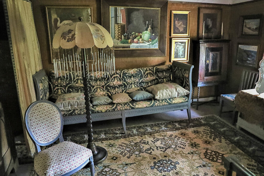 Harjula on sisustettu Suomesta ja ulkomailta peräisin olevilla huonekaluilla ja koristeellisilla esineillä. Punasävyinen huone oli taiteilijan työhuone, valkoinen salonki oli varattu vieraille, kirjaston seinien väri on vihreä. Seiniä koristavat maalaukset ja lukuisat talonpoikaisaiheiset ryijyt.