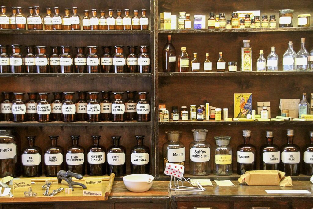 Alkuaikoina apteekkari purkitti lääkkeet asiakkaiden omiin pulloihin. Ajan myötä tilalle tulivat tutut apteekkien omat ruskeat pullot. Ruskea väri suojasi parhaiten auringon UV-säteilyltä. Pullot piti järjestää offensiivin eli asiakastilan hyllyille hyvään järjestykseen. Tällä annettiin asiakkaille vaikutelma apteekkarin ammattitaidosta.