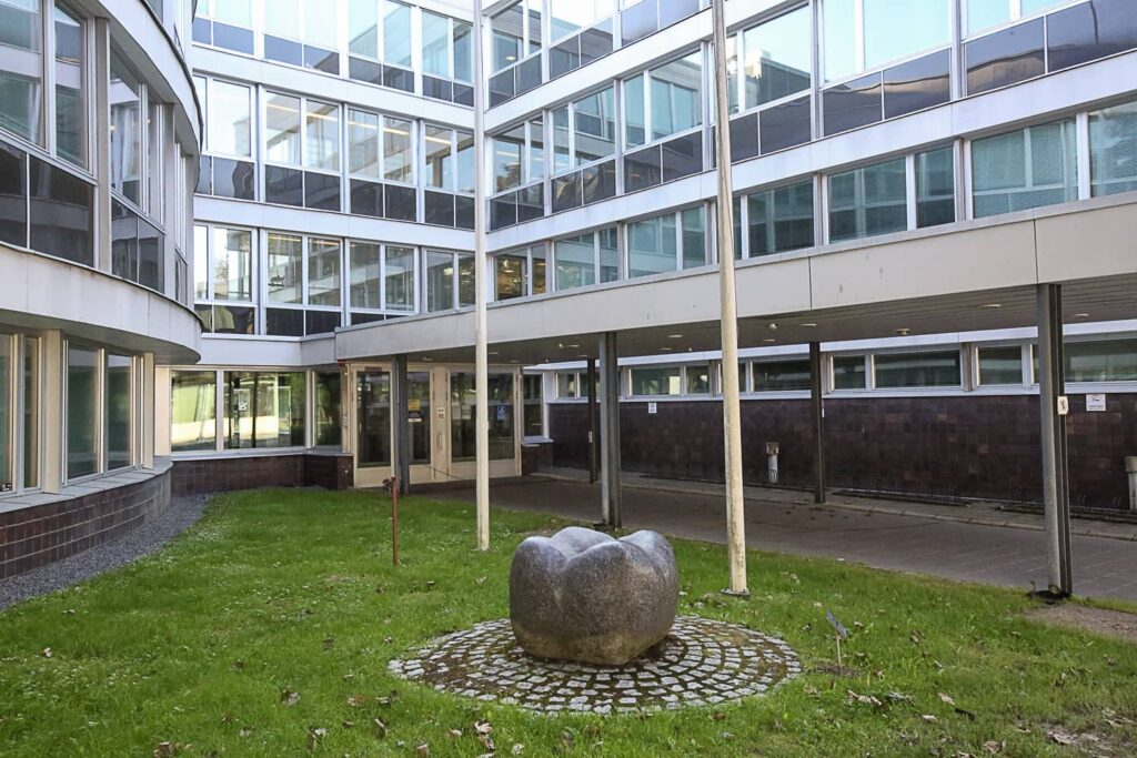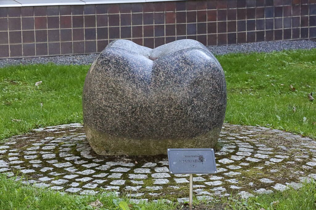 Pyöreän rakennuksen sisäänkäynnin yhteydessä Lemminkäisenkadun varrella on veistos, jonka ulkonäöstä ei voi erehtyä. Ilmiselvä poskihammas. Taideakatemiasta valmistuneen Anne Melinin opinnäytetyö on nimetty osuvasti nimellä Hammaskivi. Kerrotaan, että taiteilija otti mallia omasta hampaastaan. Teos paljastettiin vuonna 2007.