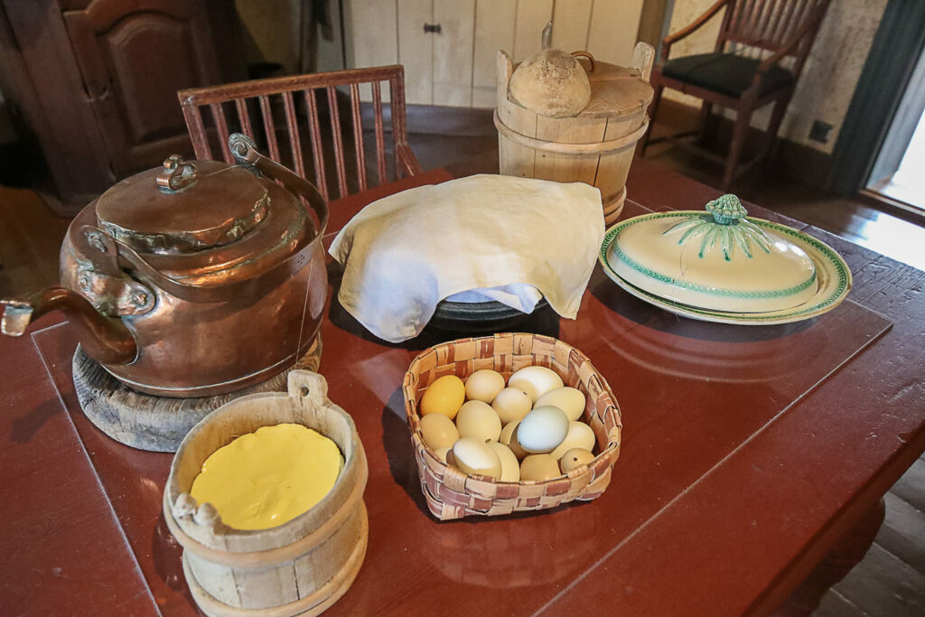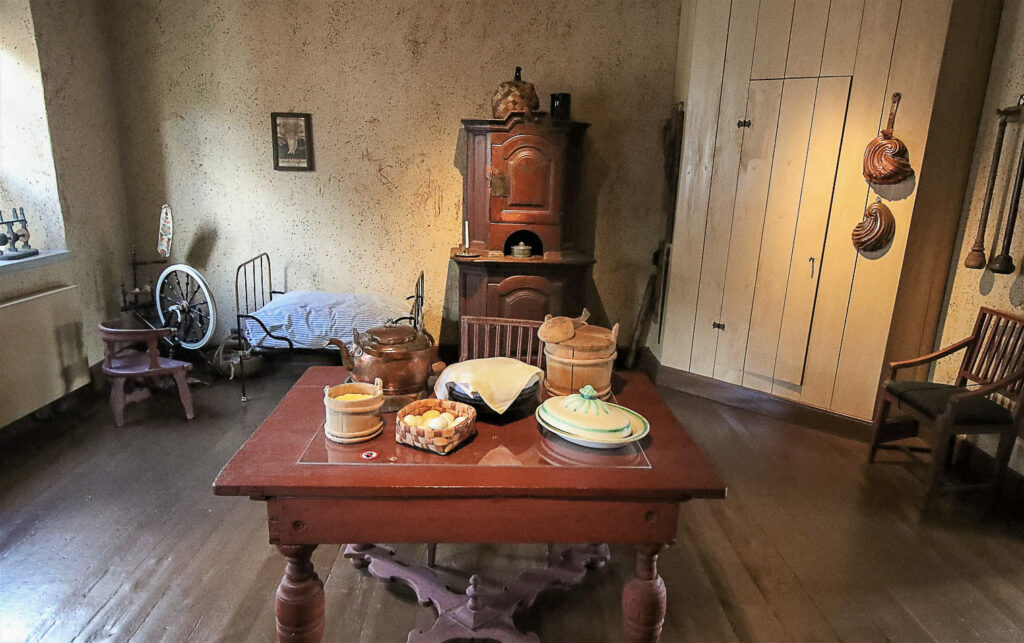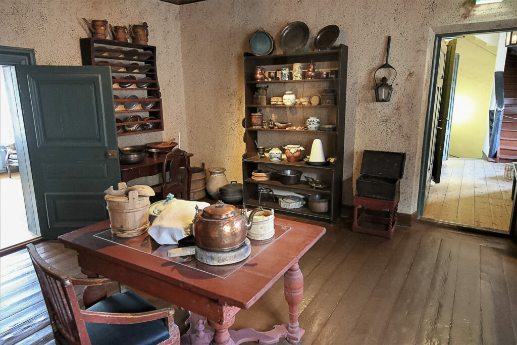 Keittiökammarin pöydällä on Holmin perheelle kuuluneita astioita. Komeaa salia käytettiin juhlatilaisuuksissa. Keskilattia jätettiin tyhjäksi ja istuimet sijoitettiin huoneen reunoille.