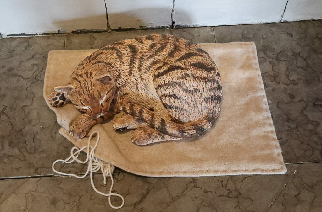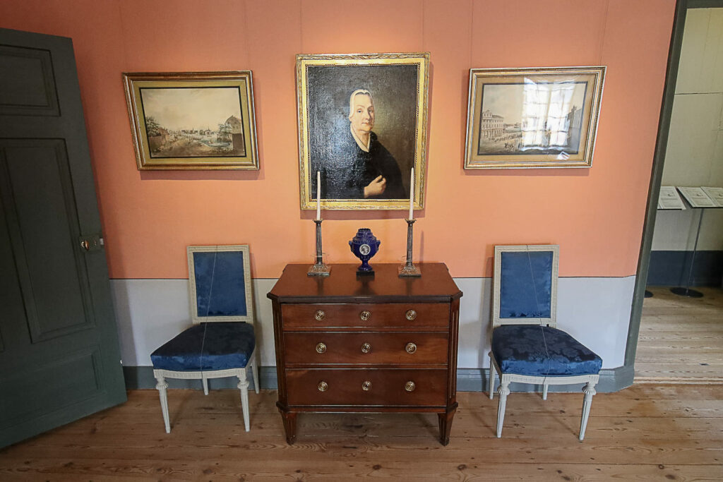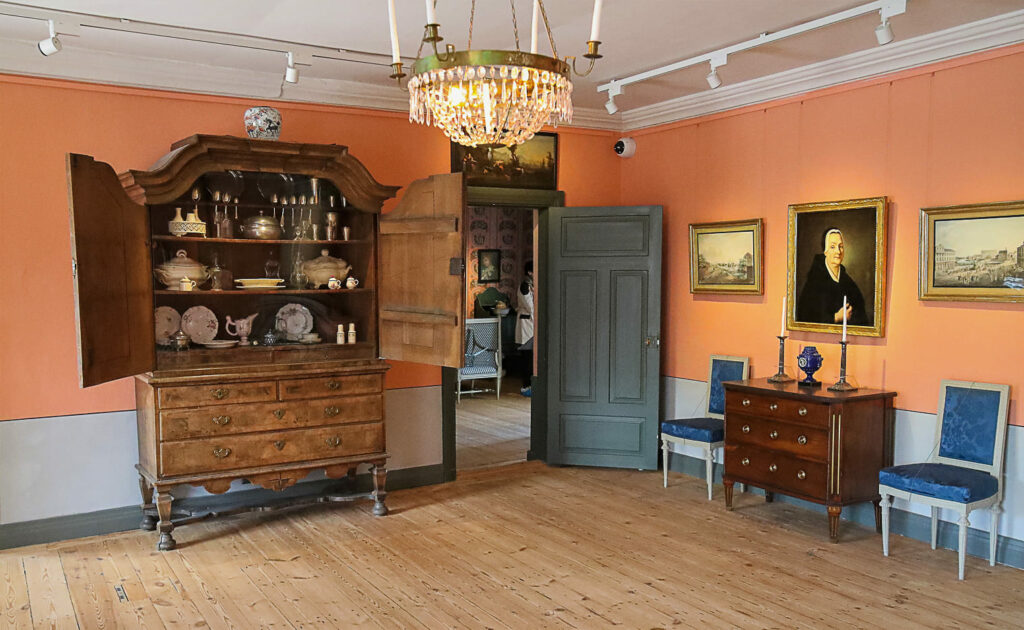 Aitoa tunnelmaa luodaan isoilla peileillä ja kristallikruunuilla sekä seinälampeteilla. Huonekalut edustavat eri tyylisuuntia. Kaapeissa on esillä 1700-luvun lasi-, keramiikka- ja hopeaesineitä.