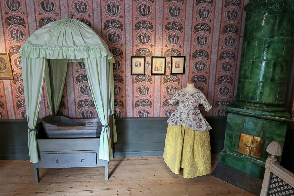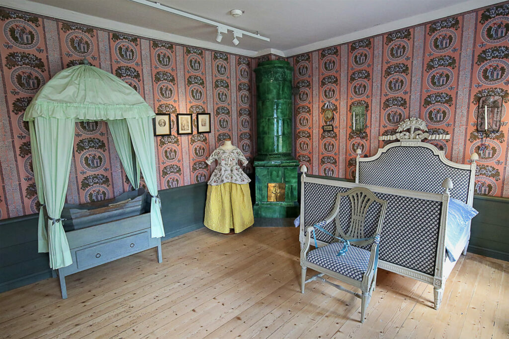 Kustavilaistyyliin sisustetussa makuuhuoneessa on muun muassa päästä vedettävä sänky ja nahkakantinen myötäjäisarkku sekä kampauspöytä.