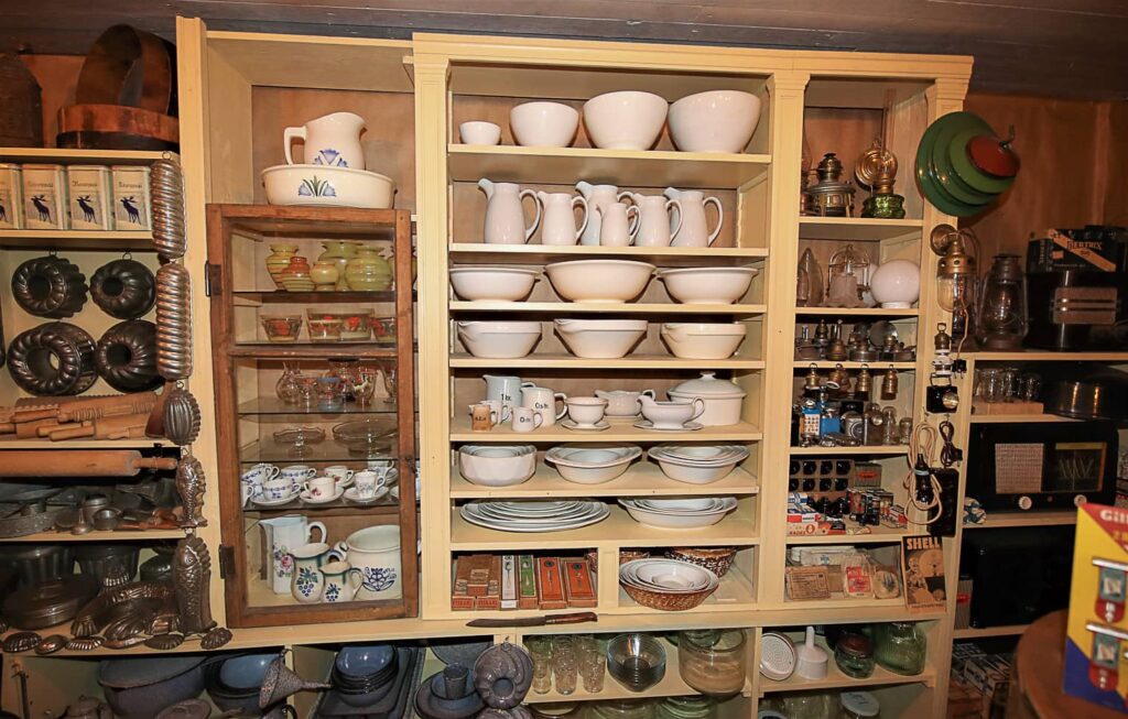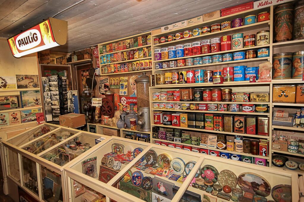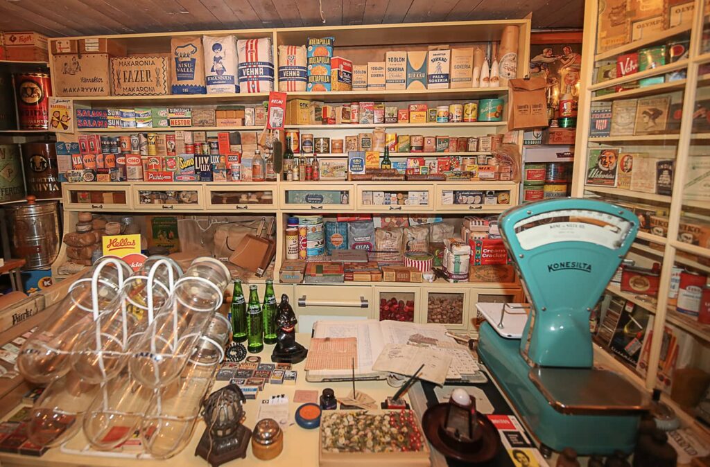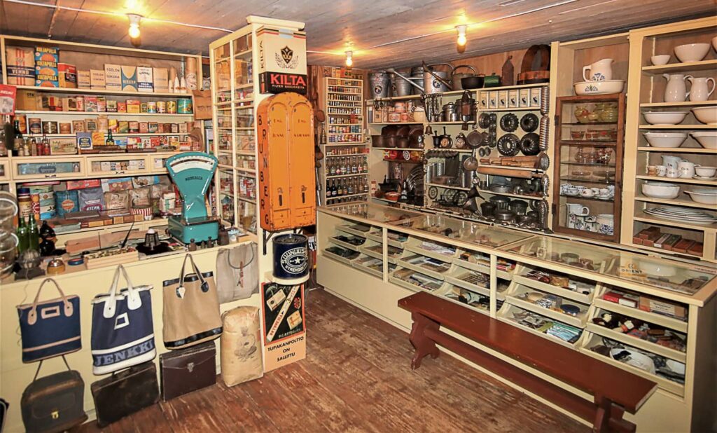 Kyläkaupan kalustus, hyllyt, vitriinit ja lattiat, tehtiin kierrätysmateriaalista. Kyseessä on eräs Suomen monipuolisimmista kauppamuseoista. Lopputulos on niin autenttinen, että osa kävijöistä erehtyy luulemaan, että tilassa olisi oikeasti joskus toiminut kauppa. Vanhojen tuotepakkauksien ja purkkien iso määrä tekee niin suuren vaikutuksen.