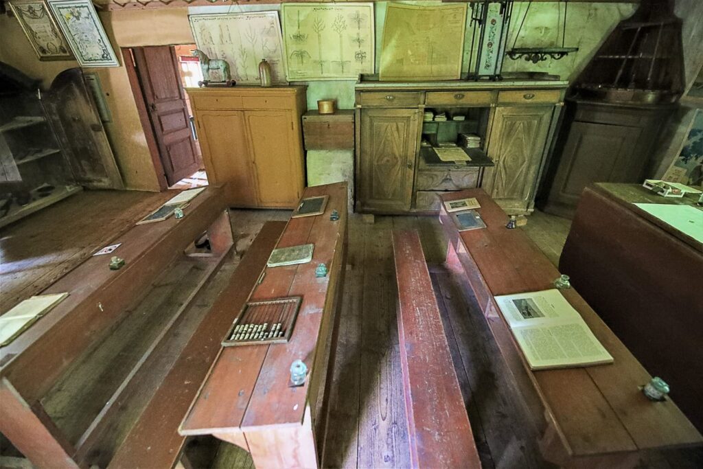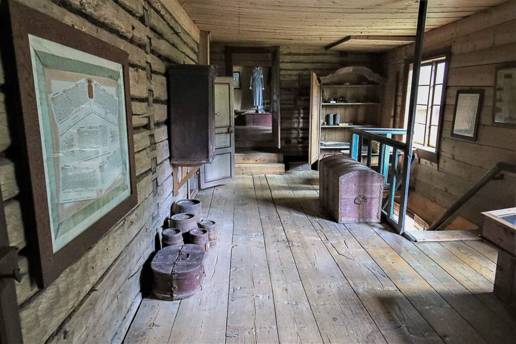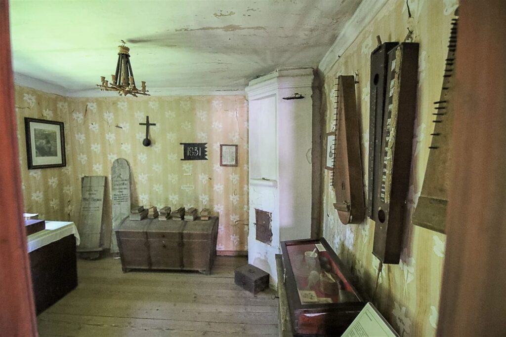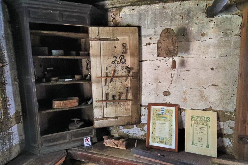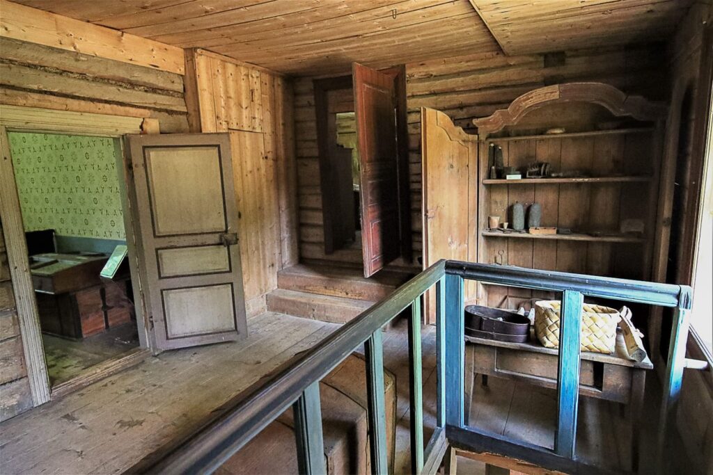 Yläkerrassa ovat sali, kirkkohuone, kiertokoululuokka ja makuuhuoneet vieraita varten. Talonpoikaisesineiden lisäksi esillä on useita Sammatin suurmiehelle, Elias Lönnrotille, kuuluneita esineitä. Yksi huone on sisustettu kouluaiheisilla esineillä.
