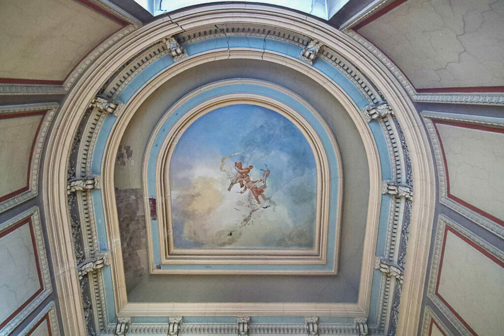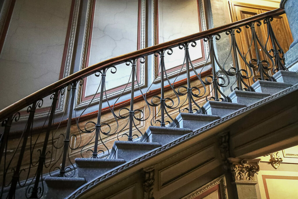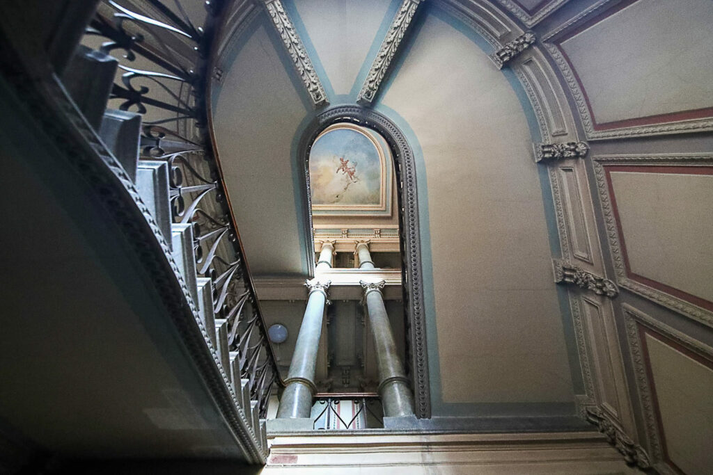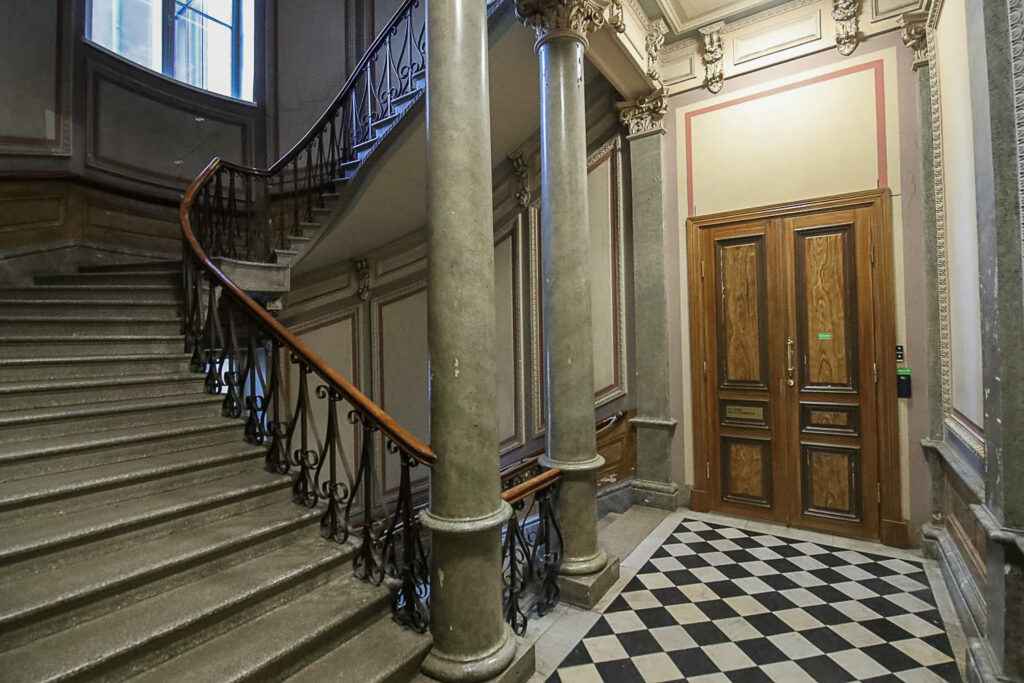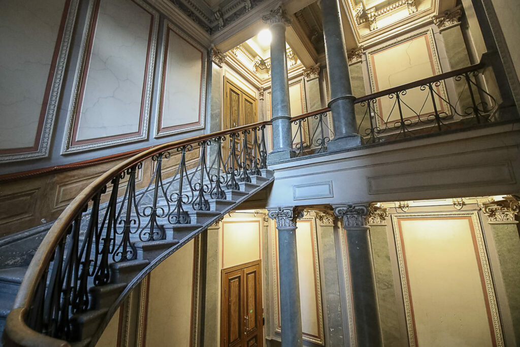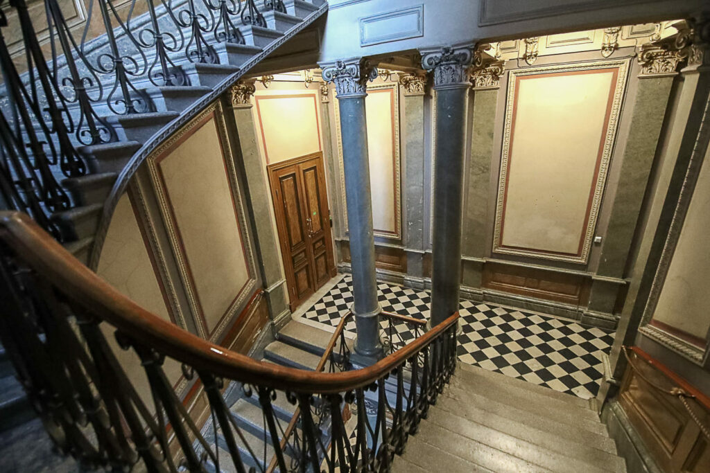 Varsinainen ilotulitus alkaa porrashuoneessa. Korinttilaiset pylväät, kattopintojen kasetit ja kipsikoristeet sekä takorautakaiteet luovat entisaikojen tunnelmaa. Kaiken kruunaa kaarevasti ylöspäin nousevien portaiden yläpuolelle sijoitettu kahta alastonta poikalasta esittävä maalaus.
