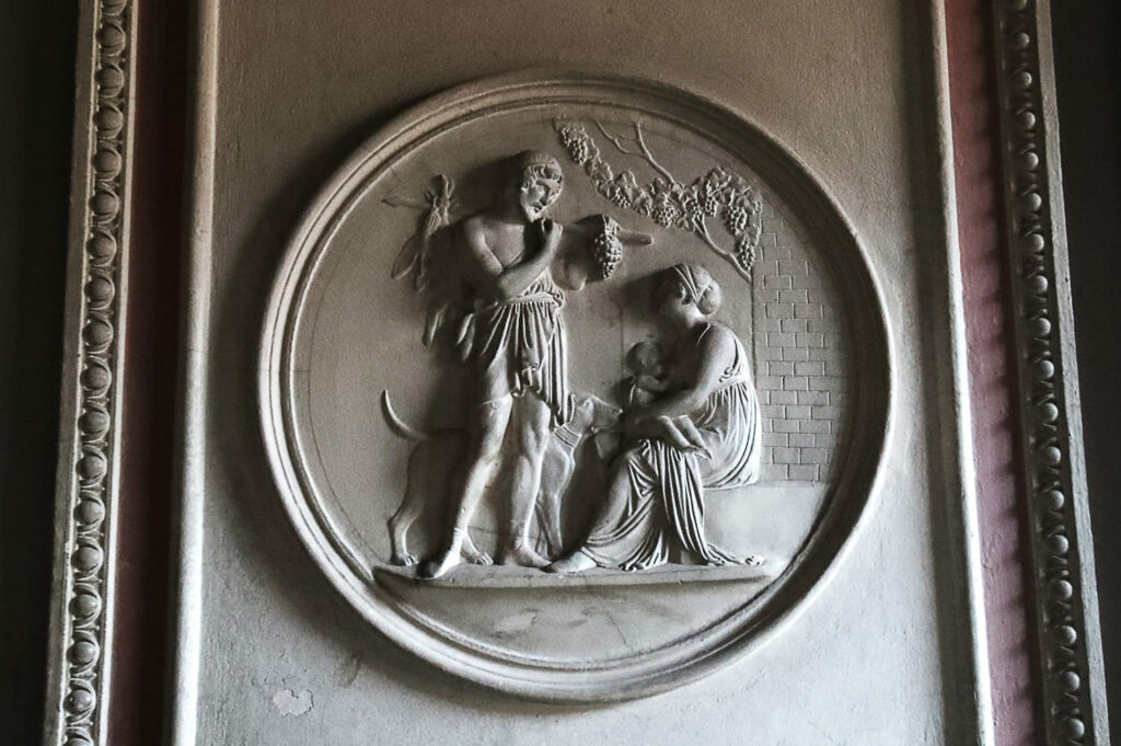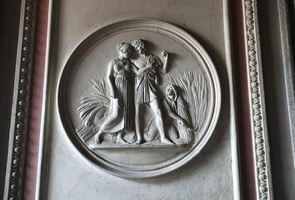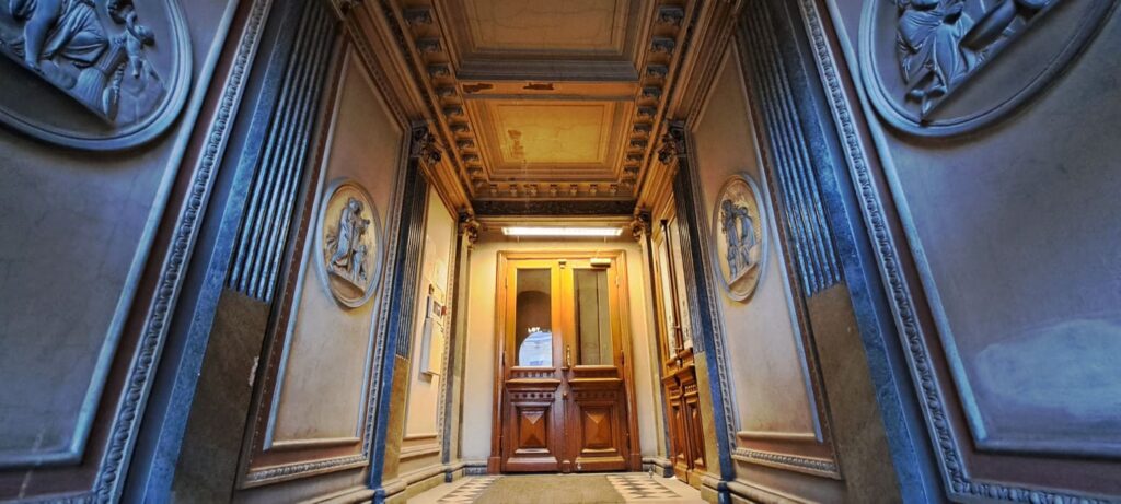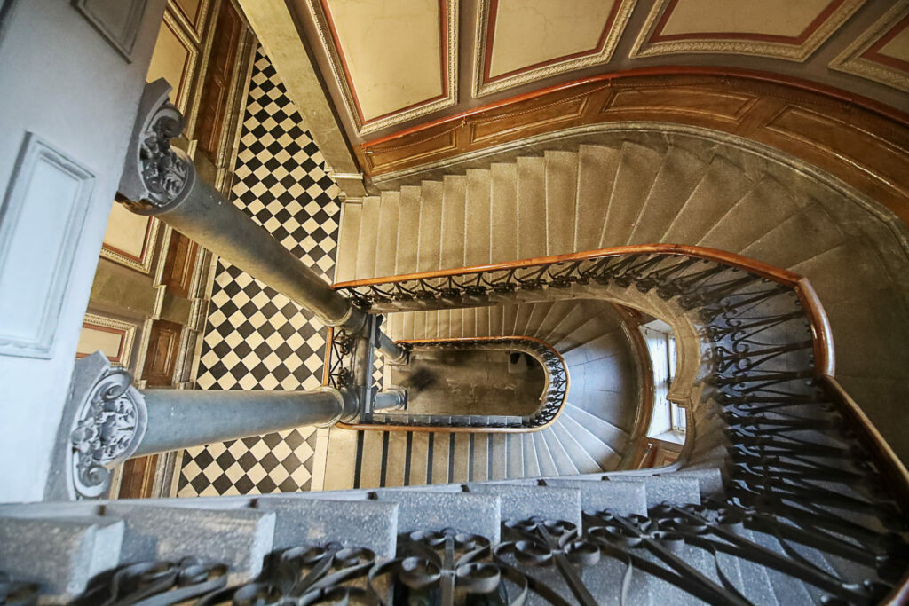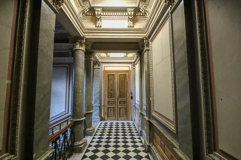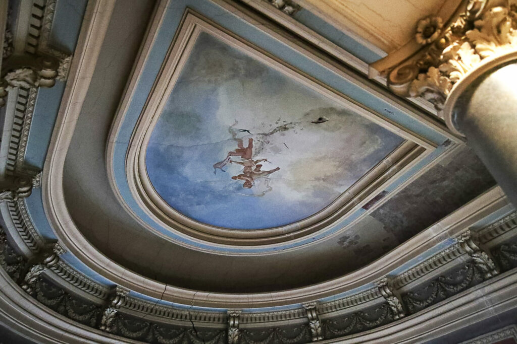 Varsinainen ilotulitus alkaa porrashuoneessa. Korinttilaiset pylväät, kattopintojen kasetit ja kipsikoristeet sekä takorautakaiteet luovat entisaikojen tunnelmaa. Kaiken kruunaa kaarevasti ylöspäin nousevien portaiden yläpuolelle sijoitettu kahta alastonta poikalasta esittävä maalaus.