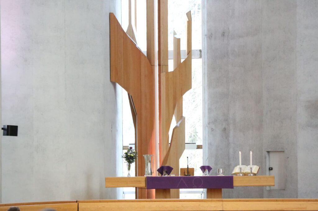 Kirkon lattian laskeutuu kohti alttaria mahdollistaen samalla paremman näkyvyyden.