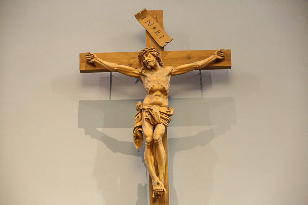 Alttaritaulu puuttuu, mutta sen tilalla on puinen krusifiksi. Se on hankittu Saksan pienestä Oberammergaun kylästä, joka on tunnettu kymmenen vuoden välein esitettävästä Kärsimysnäytelmästä sekä raamatullisista puuveistoksistaan. Kalvolan kirkon krusifiksi ei siis ole peräisin keskiajalta, kuten monet vastaavat veistokset vanhoissa kirkoissamme.