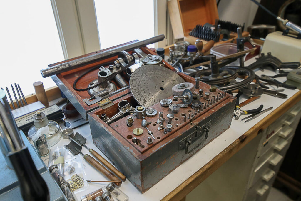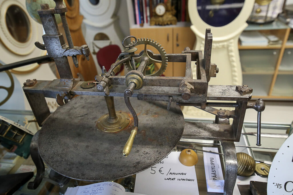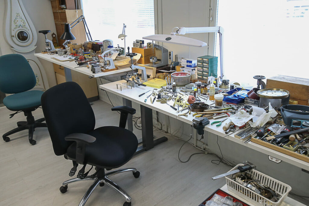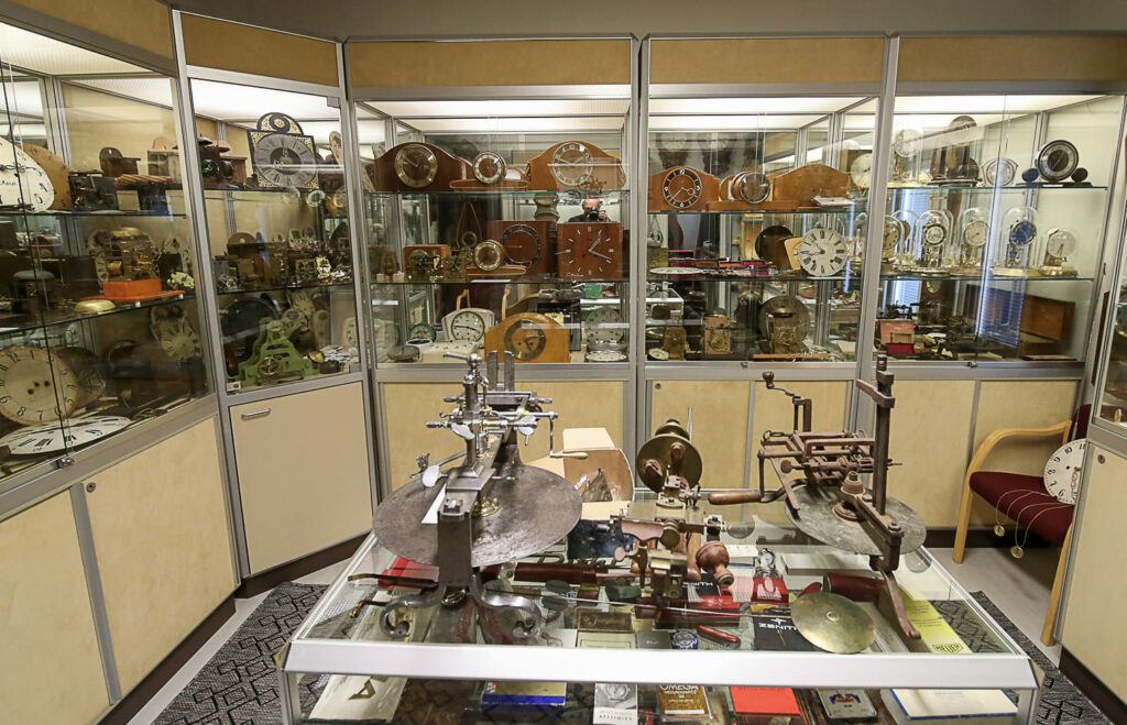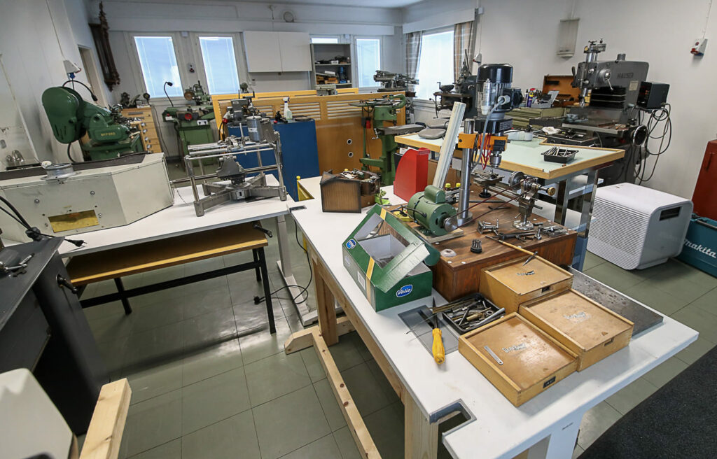 Lukemattomien kellojen ohella tilat täyttyvät suurikokoisista laitteista, kuten porakoneista, sorveista ja jyrsimistä. Näkymä on kuin olisi metallityöpajassa. Laitteet ovat hienomekaniikasta vähemmän ymmärtävälle mystisen näköisiä.