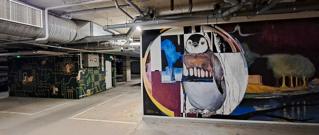 Koska työpaikkoja on paljon, tarvitaan runsaasti myös paikoitustilaa. Sitä löytyy maan alta rakennusten pohjakerroksista. Kyse ei olekaan ihan tavallisista autojen ”betonibunkkereista”, vaan tylsän harmaat seinät ovat saaneet väriloistoa. Yli viisikymmentä taideteosta koristavat BioCityn ja DataCityn parkkihalleja.