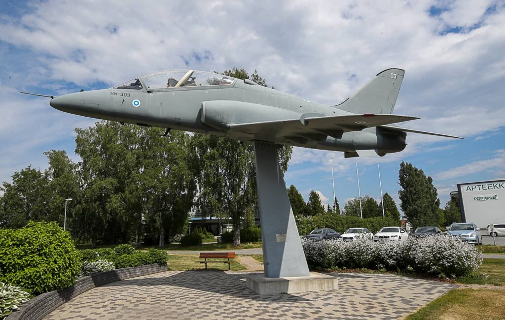Toinen tolpan nokassa oleva kone on Hawk-suihkuharjoituskone. Ensimmäiset koneet luovutettiin Ilmavoimille vuonna 1980. Puiston  HW-303 koneen viimeinen lento tapahtui kesällä 2011.