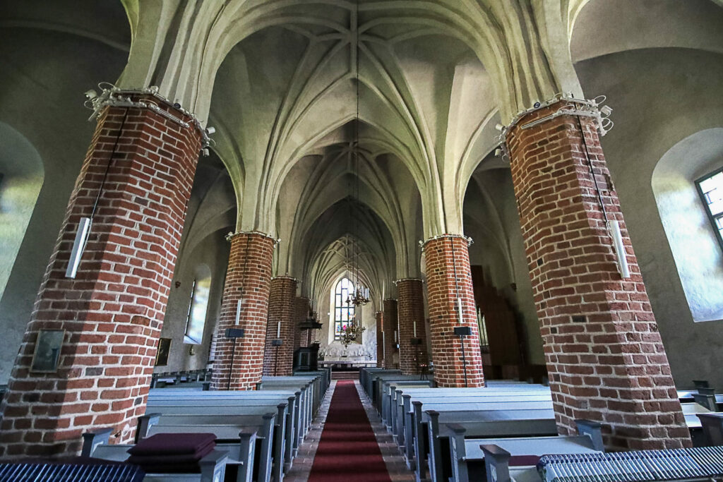 Runkohuone vaikuttaa kookkaalta, onhan sillä pituutta liki 40 metriä. Katto on yhä korkealla, vaikka sitä on aikoinaan madallettu useilla metreillä. Kirkkosali on kolmilaivainen. Kaikki laivat ovat samanlevyisiä. Holveja kannattelee useampi kahdeksankulmainen tiilipylväs. Pylväät ovat niin kookkaita, että ihan jokaiselta paikalta ei edes näe alttarille asti.