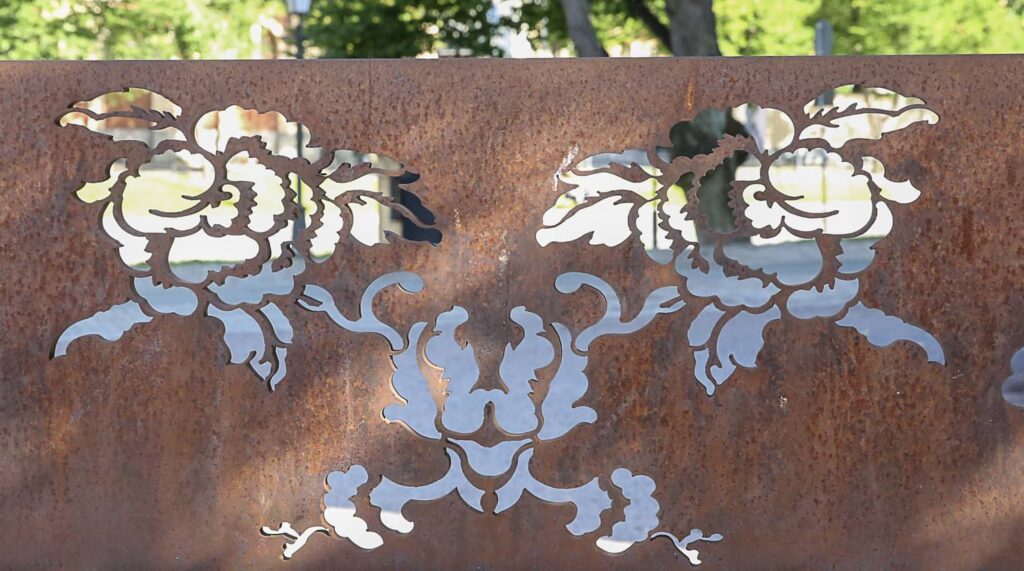Vaikka Kertosäe on valmistettu raskaasta teräslevystä, symmetrisesti aseteltu ruusuornamentiikka antaa teokselle kepeyttä. Ruosteen ruskea värikin sopii mainiosti historialliseen ympäristöönsä.