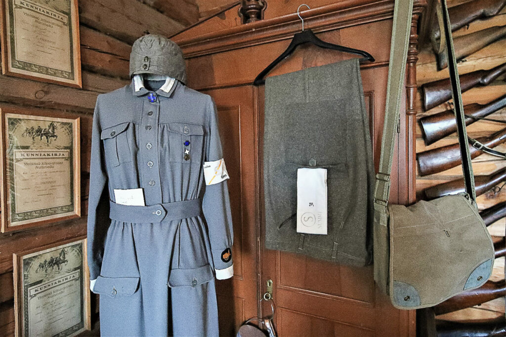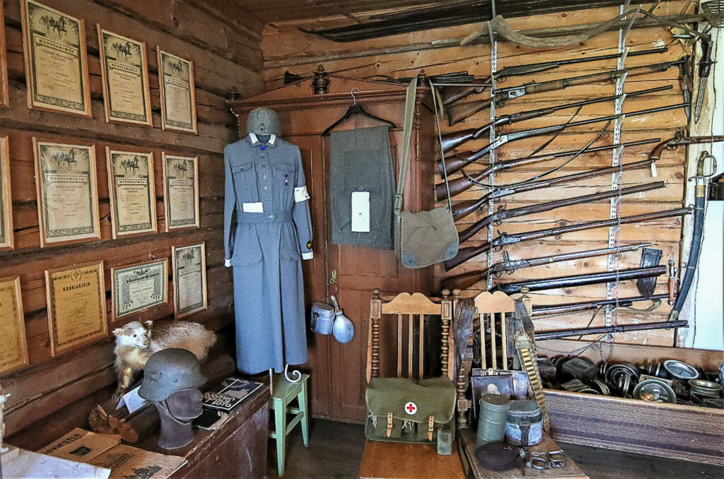 Metsästyksen merkityksestä muistuttaa lukuisat aseet ja pyydykset. Yhtenä erikoisuutena on hevosten suokengät. Toisessa kerroksessa on nähtävänä agrologi Karhun työhuone kirjoituskoneineen ja papereineen.