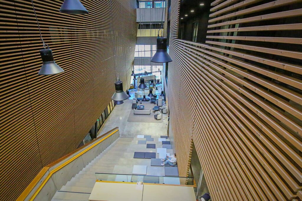 Puuta on käytetty sisustusmateriaalina paljon ja vieläpä tyylikkäästi. Henrikinkadun pääsisäänkäynnin kaareva puurimoitus, kotimaista lämpökäsiteltyä puuta, jatkuu talon sisäpuolella koko rakennuksen korkuisena aina ylös kattoikkunoihin asti.