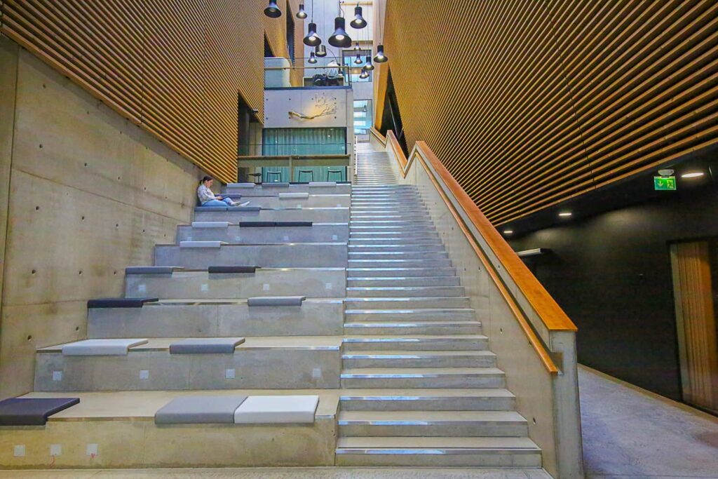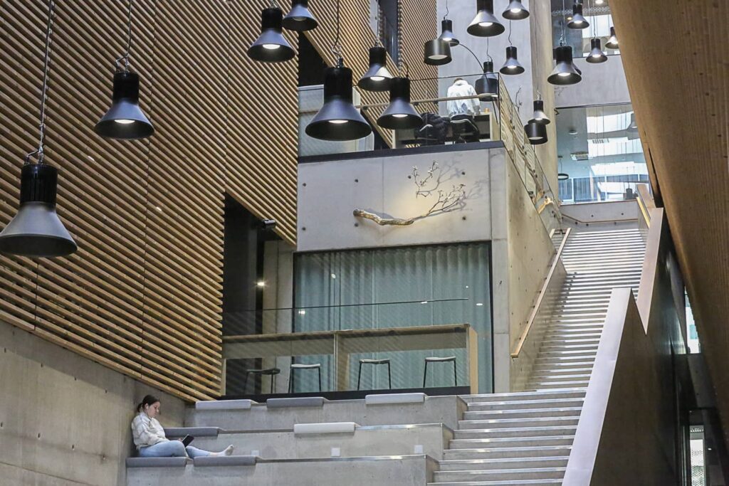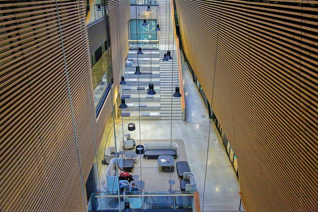 Betoniportaita ja -tasoja pitkin voi edetä kerroksesta toiseen samansuuntaisesti kuin kävelisi Yliopistonmäkeä ylös. Vaikutelma on hieno. Kerroksien lepotilat luovat rentoa tunnelmaa. Opiskelu- ja työskentelytilat ovat useammassa kerroksessa. Alhaalta päin katsottuna vasemmalla puolella sijaitsevat laboratoriotilat ja oikealla puolella toimistotilat. Niiden välillä on atriumin ylittäviä kulkusiltoja.