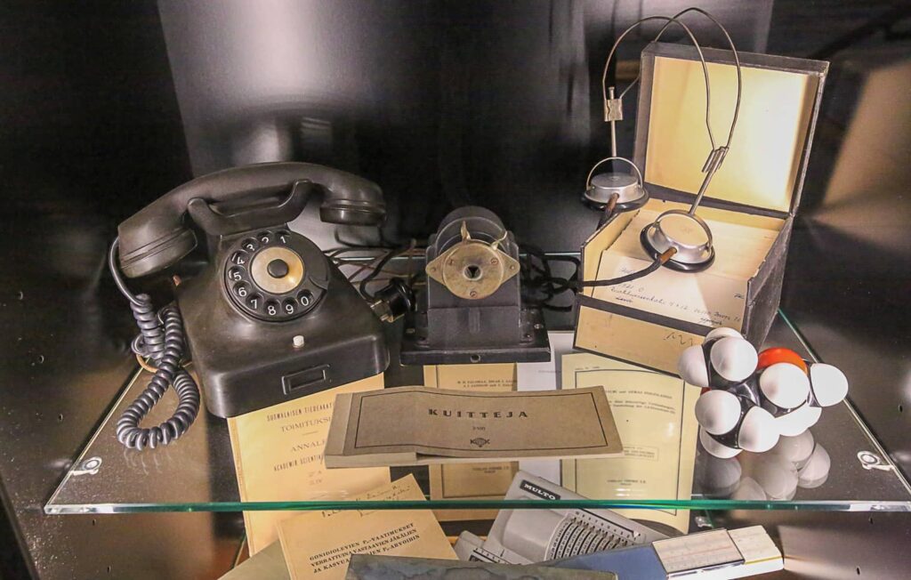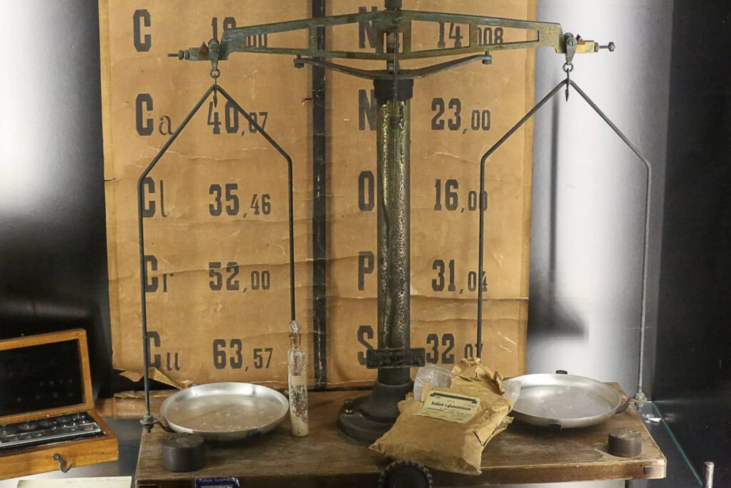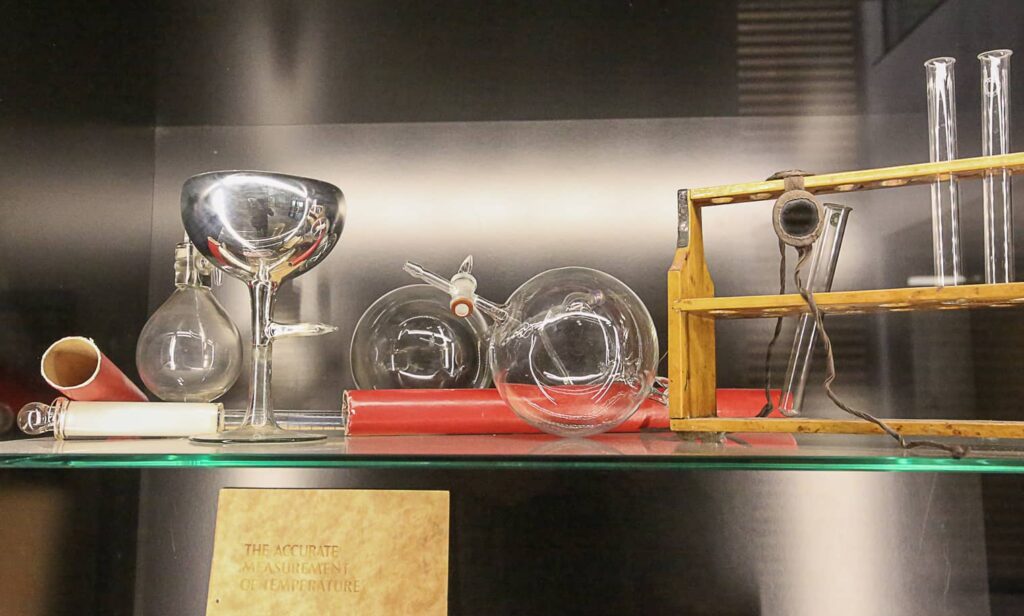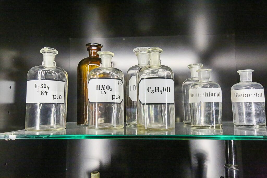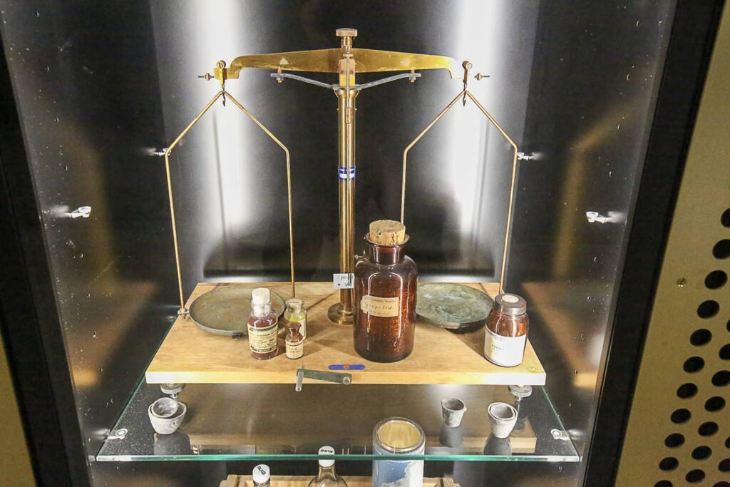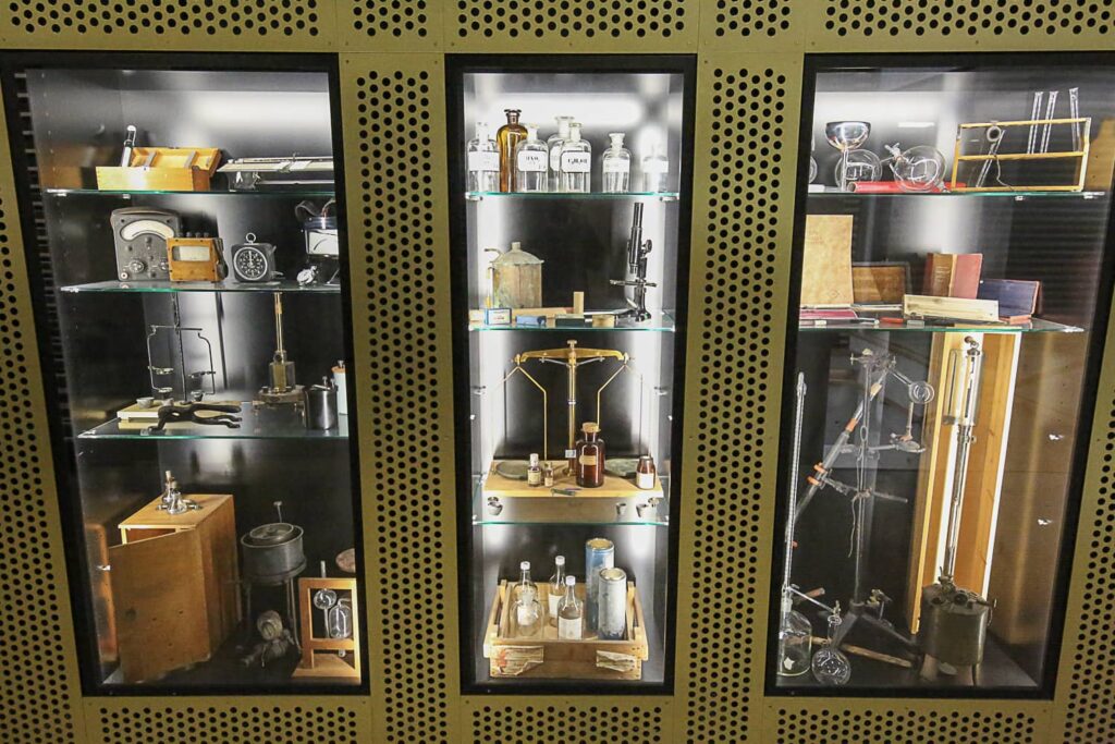 Menneisyyttäkään ei ole unohdettu, sillä esillä on vitriinejä, joissa on vanhoja laboratoriovälineitä.
