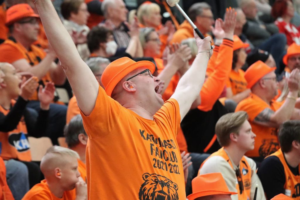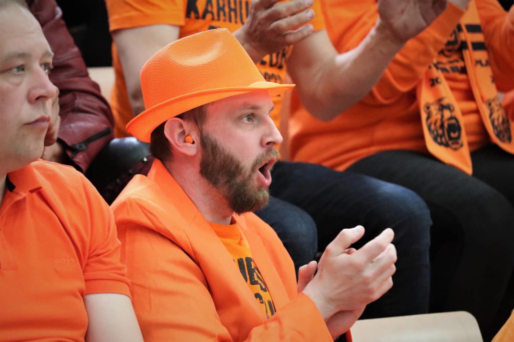 Karhu Basketin äänekkäät kannattajat asettuvat Salohallissa oman joukkueen taakse katsomon puolelle. Ennen ottelun alkua isketään yläfemmoja pelaajien ja valmentajien kanssa. Taputetaan olkapäille.