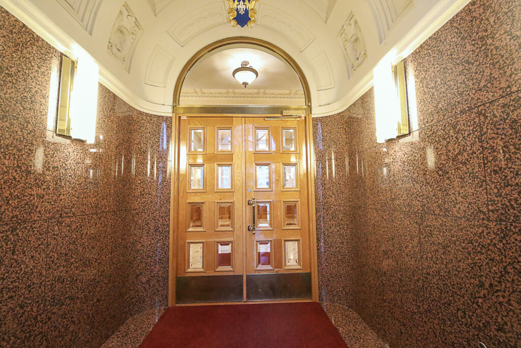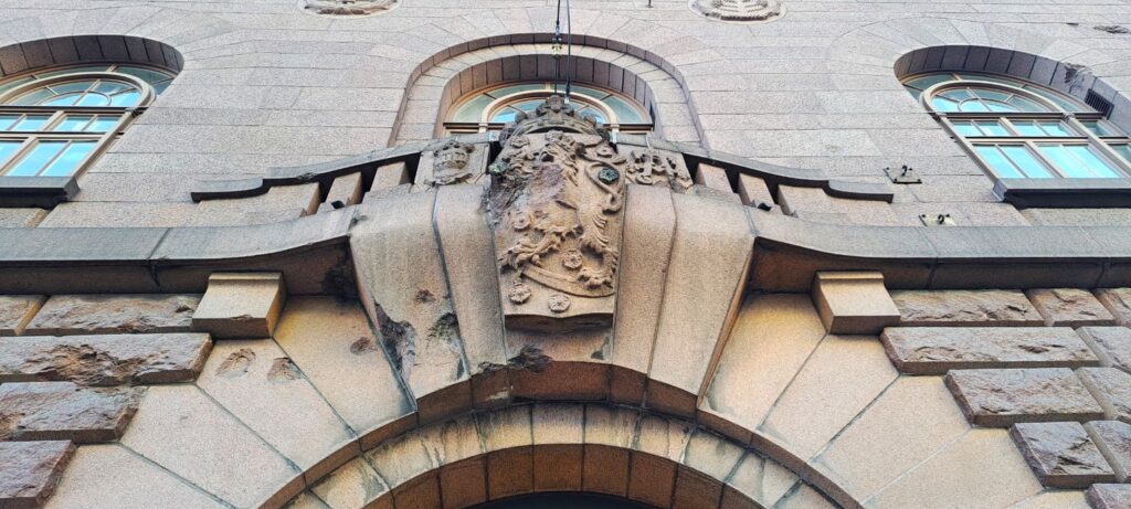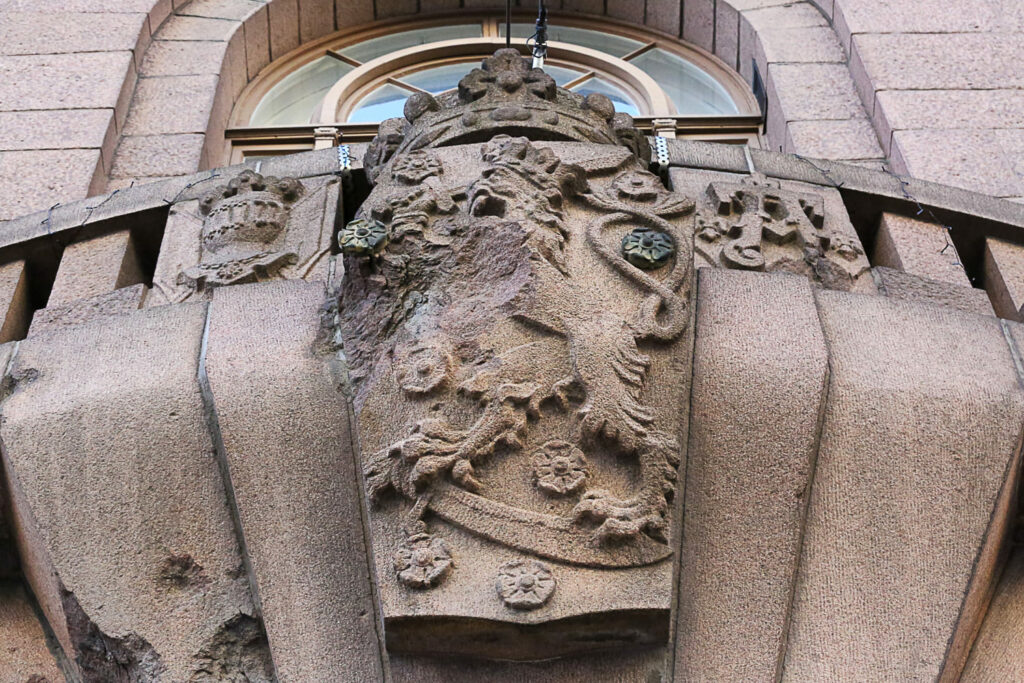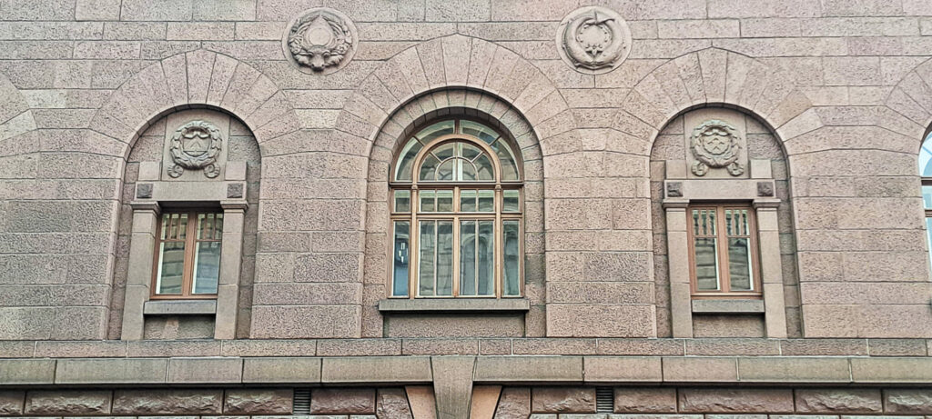 Johtokunta päätyi julkisivussa kalliiseen, mutta näyttävään ratkaisuun. Katujulkisivu haluttiin päällystää kotimaisella Hangon punaisella graniitilla, samaan tyyliin kuin monissa muissakin pankkirakennuksissa. Graniitista tehty julkisivu symboloi turvallisuutta.