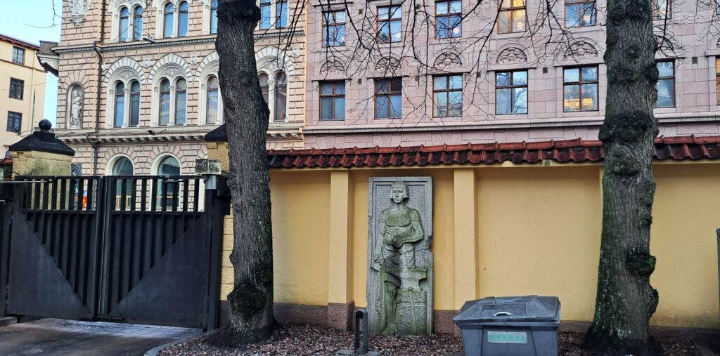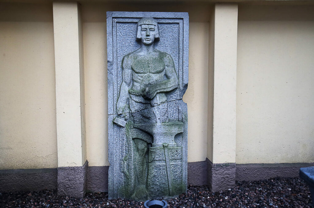 Katseelta piilossa pihan puolella on kuvanveistäjä Into Saxelinin veistos, joka on siirretty tänne Kansallis-Osakepankin Lahden toimitalosta. Saxelin kuvasi eri elinkeinoja symbolisilla teoksillaan.