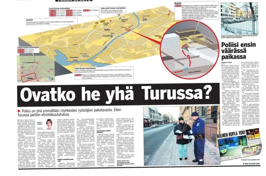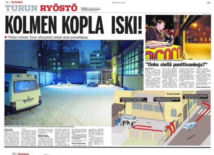 VARSINAIS-SUOMI / TURKU – Pankin henkilökunta valmistautui lastauslaiturilla rahankuljetusauton purkamiseen, kun samalla kommandopipoihin sonnustautuneet ryöstäjät kiipesivät tikkaita hyväksi käyttäen yli korkean kivimuurin.