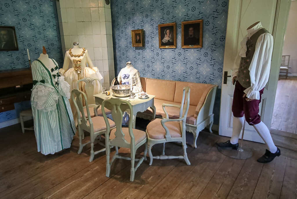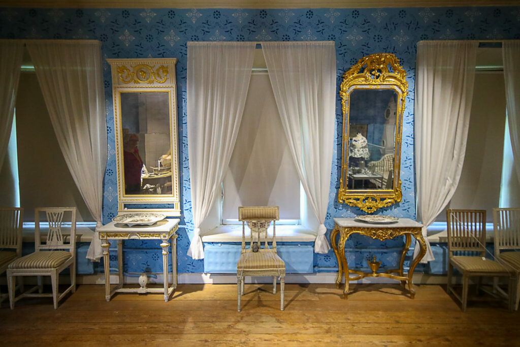 Rakennuksen sali on koristeltu alkuperäisen näköisellä värikkäällä tapetilla. Kustavilaistyyliset huonekalut on saatu lähialueiden kartanoista ja yksityiskodeista.