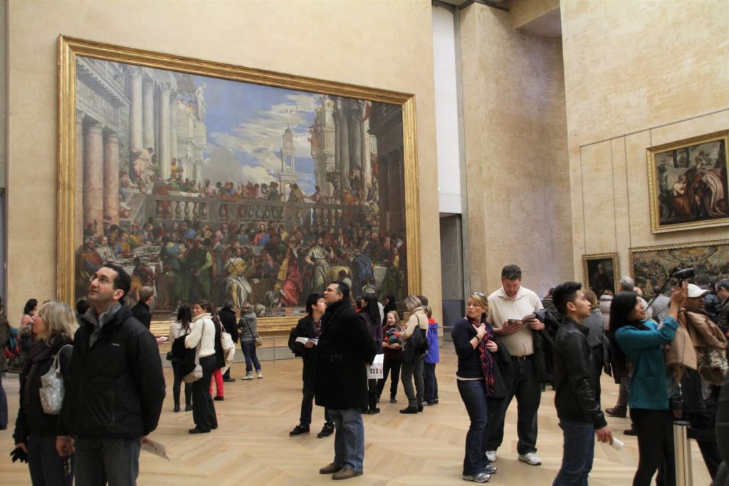Panssarilasien taakse ja turvaköyden suojaan sijoitettu pieni maalaus synnyttää eteensä uteliaan turistilauman. Näky on koominen, sillä salin vastakkaiselle seinälle ripustettu jättikokoinen, mutta tuntemattomamman Paolo Veronesen Kaanaan häät saa vain murto-osan Mona Lisan huomiosta.