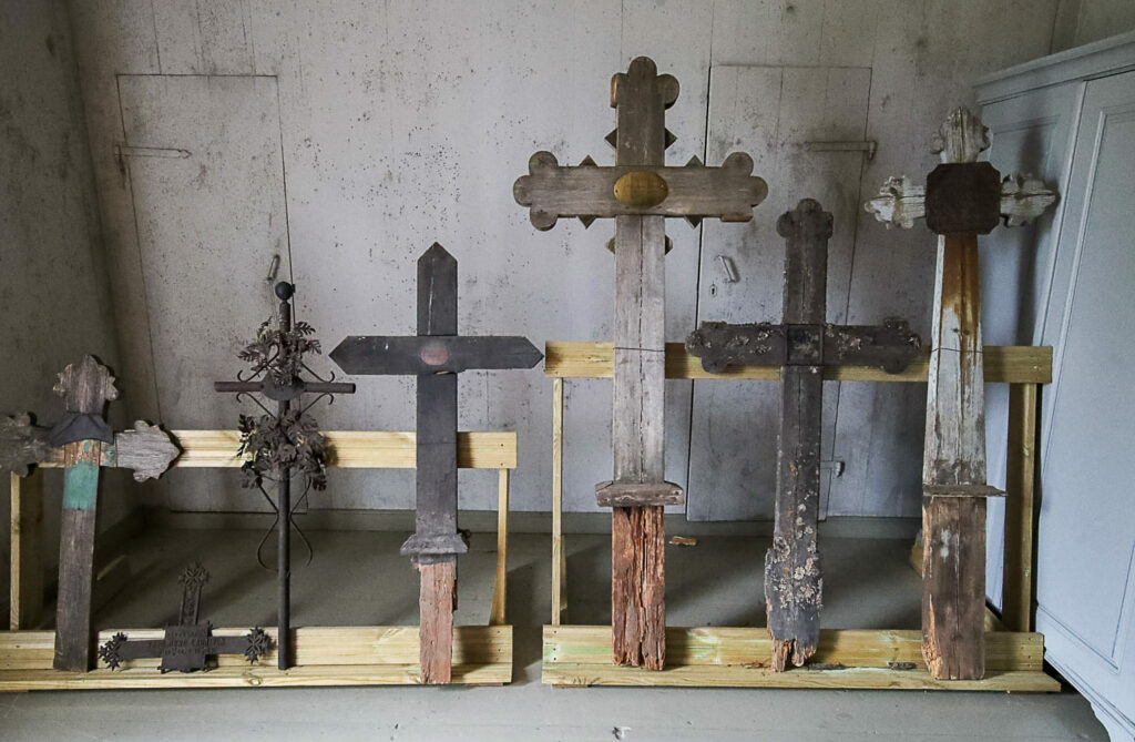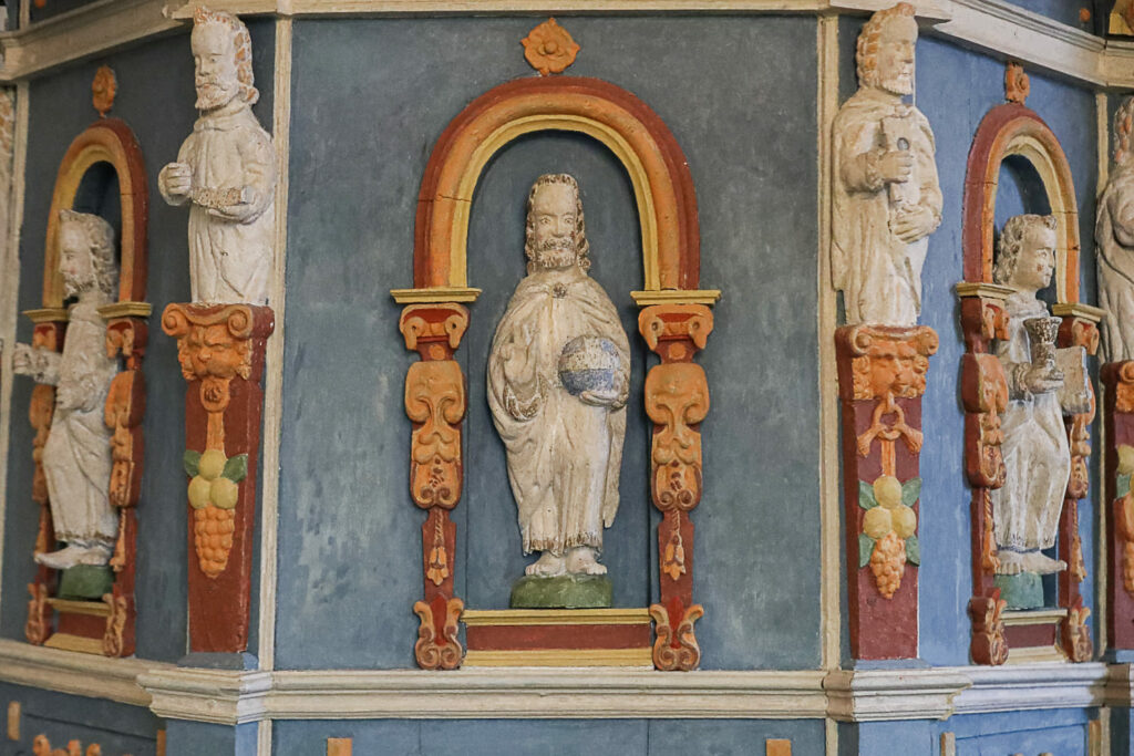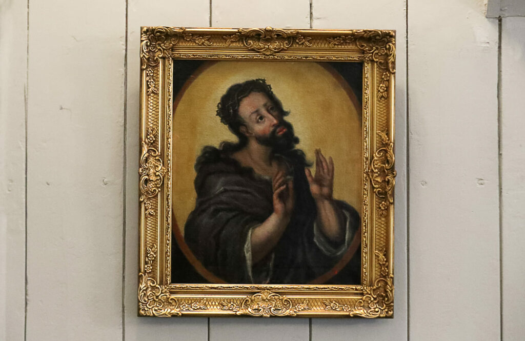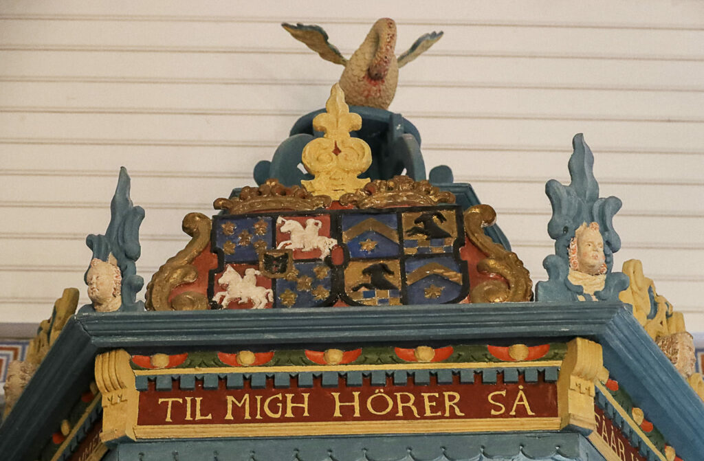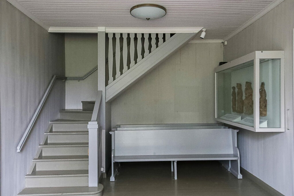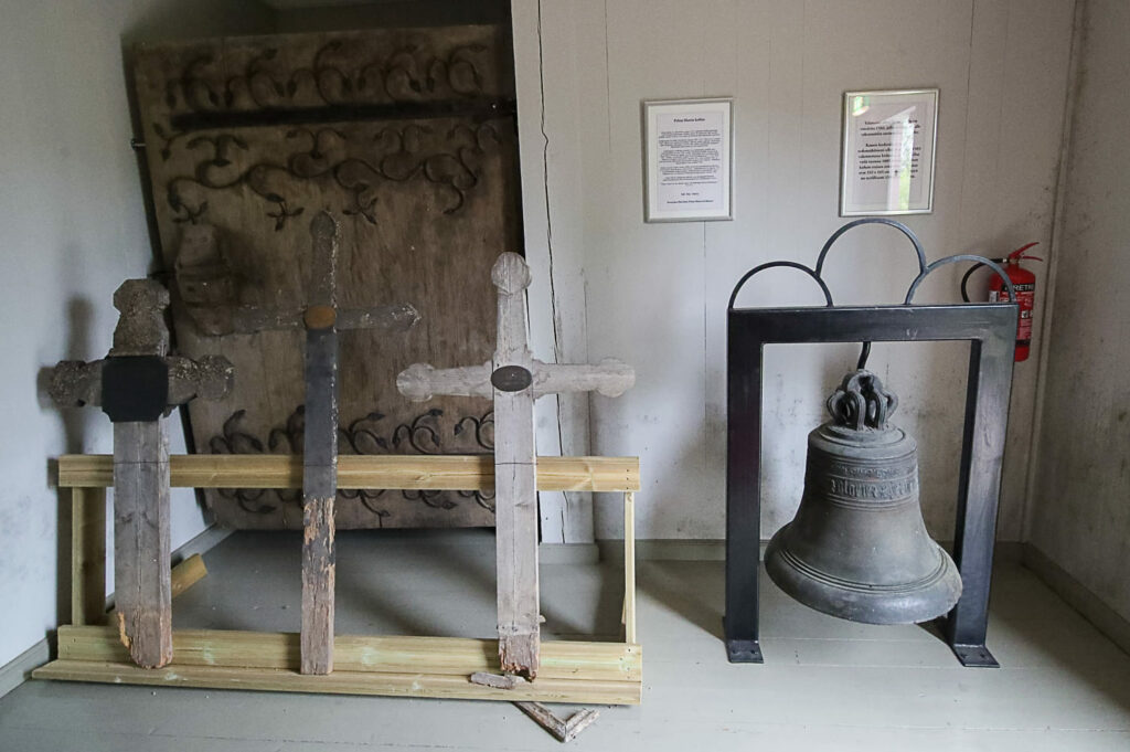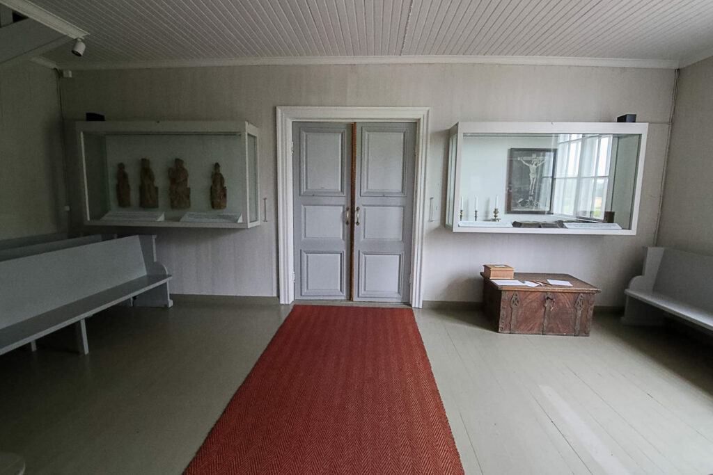 Kirkon länsipäädyn sisääntuloaulaan on sijoitettu kirkon historiasta kertovia esineitä, kuten vanhoja hautaristejä. Massiivinen ovi on entisen kirkon ovi 1500-luvulta. Ovea käytettiin vielä 1800-luvulla nykyisen kirkon ovena. Esillä on myös ensimmäisen kirkon kirkonkello.