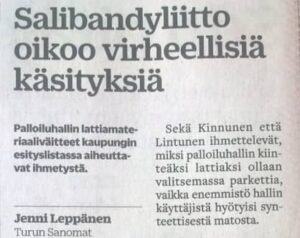 Kuvaavaa silloiselle tilanteelle oli, että Salibandyliitto ja FBC Turun toiminnanjohtajakin Ville Lintunen sai oikoa lehtihaastatteluissa päättäjille virheellisiä käsityksiä. Turun kaupunginhallituksen esityslistalla kerrottiin muovimassalattiasta. Termi viittaa pahamaineiseen suoraan betonin päälle ruiskutettuun kierrätysmuovimassaan.