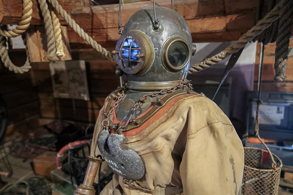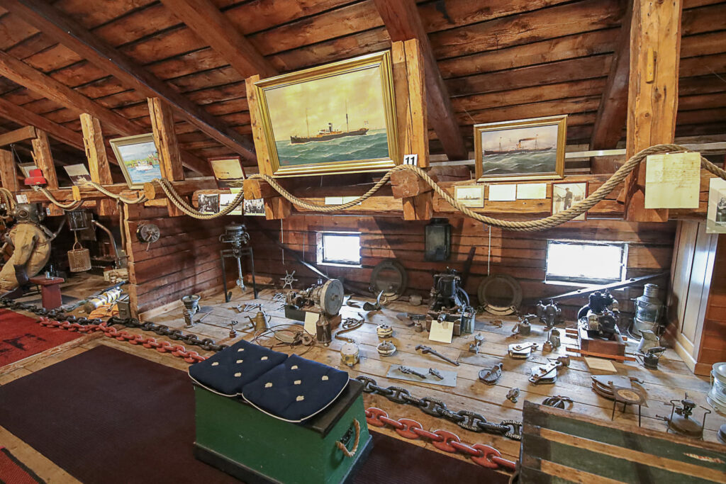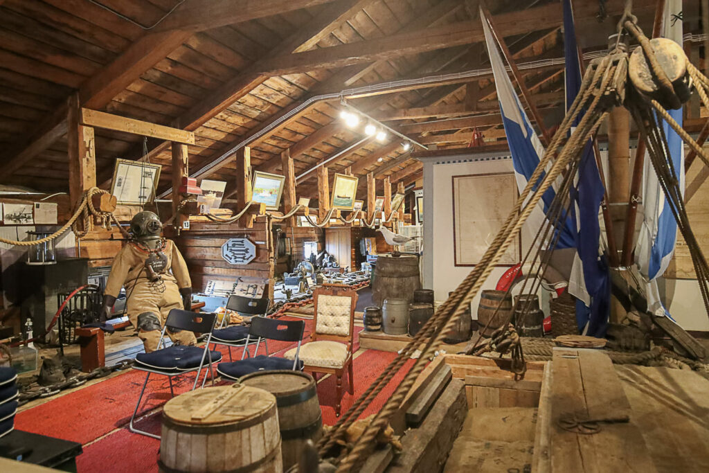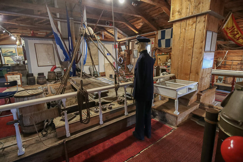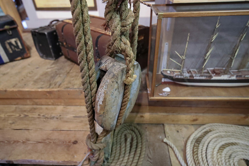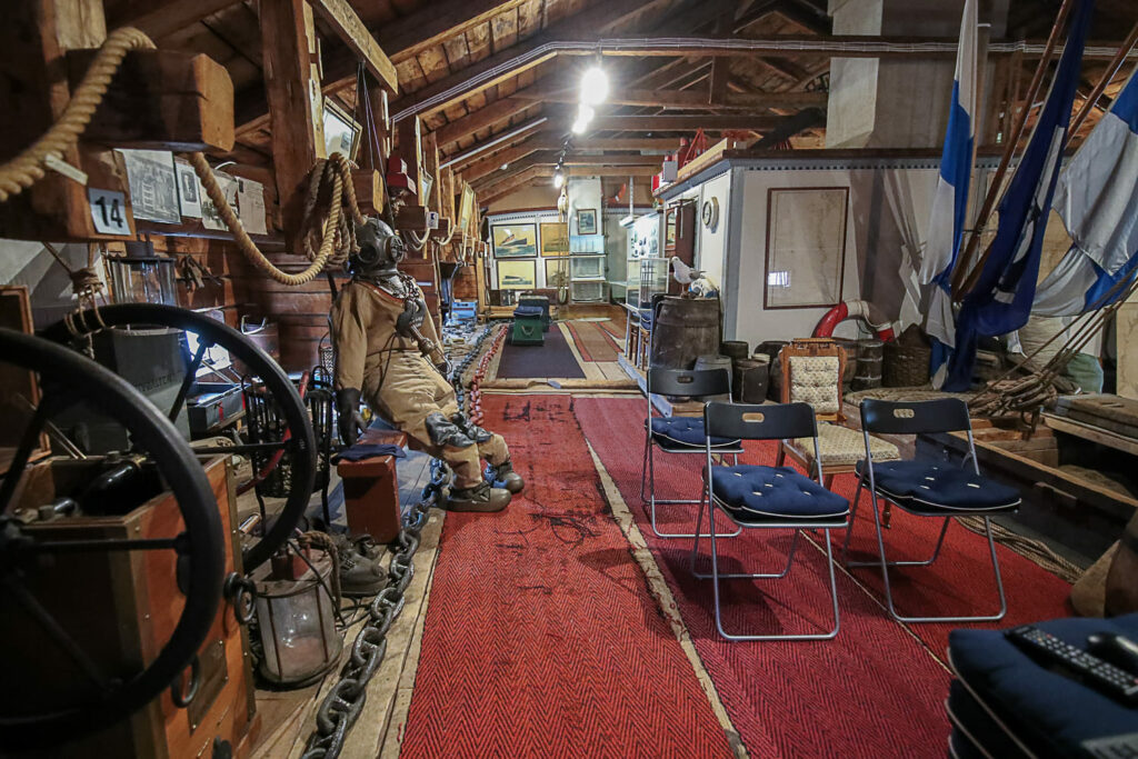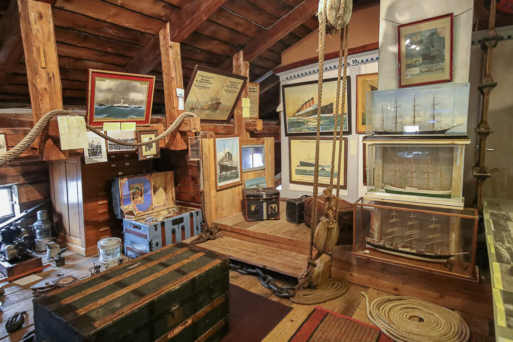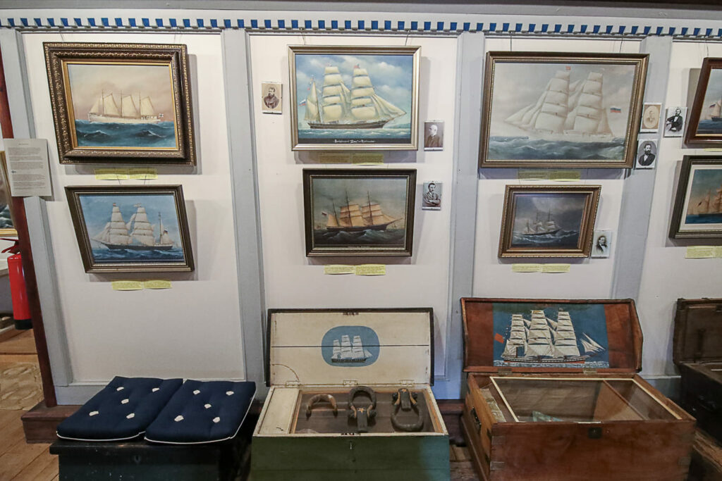 Nähtävänä on purjelaivakauden varusteita, pienoismalleja, lippuja ja viirejä, laaja kokoelma merenkulkuaiheisia maalauksia, valokuvia, navigointivälineitä, merimieskirstuja ja ulkomaiden eksoottisia esineitä. Eräs kiehtovimmista yksityiskohdista on vanhanmallinen sukelluspuku ja kipparin metrin pituiset piiput.