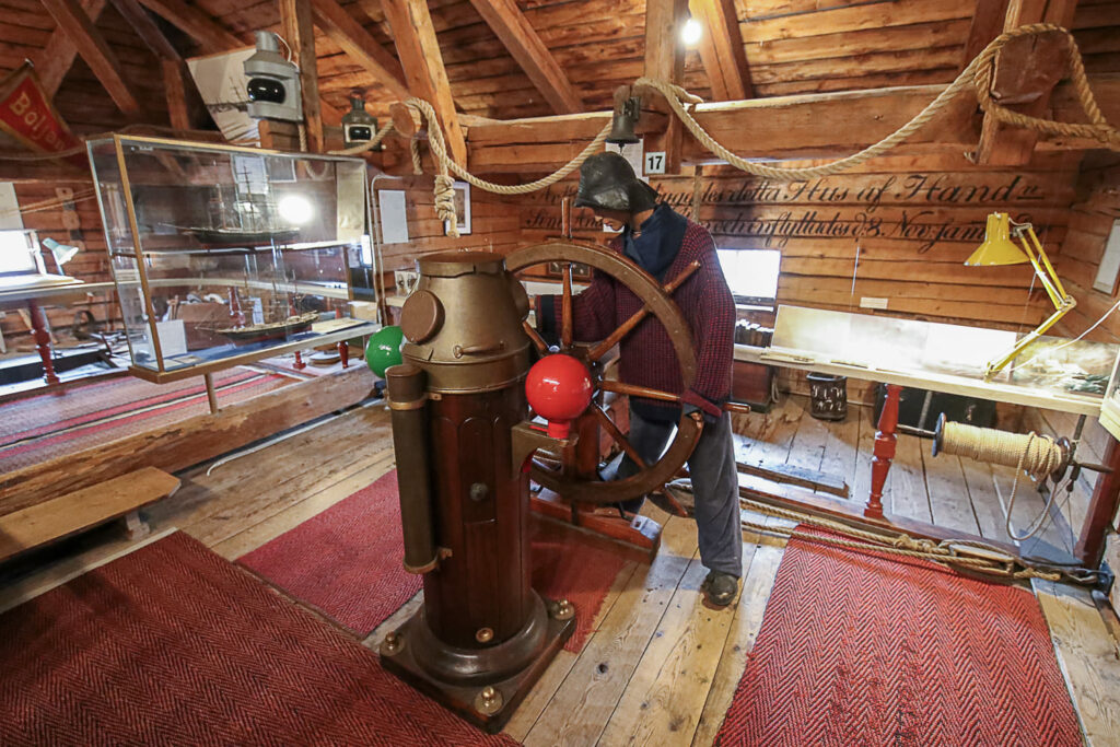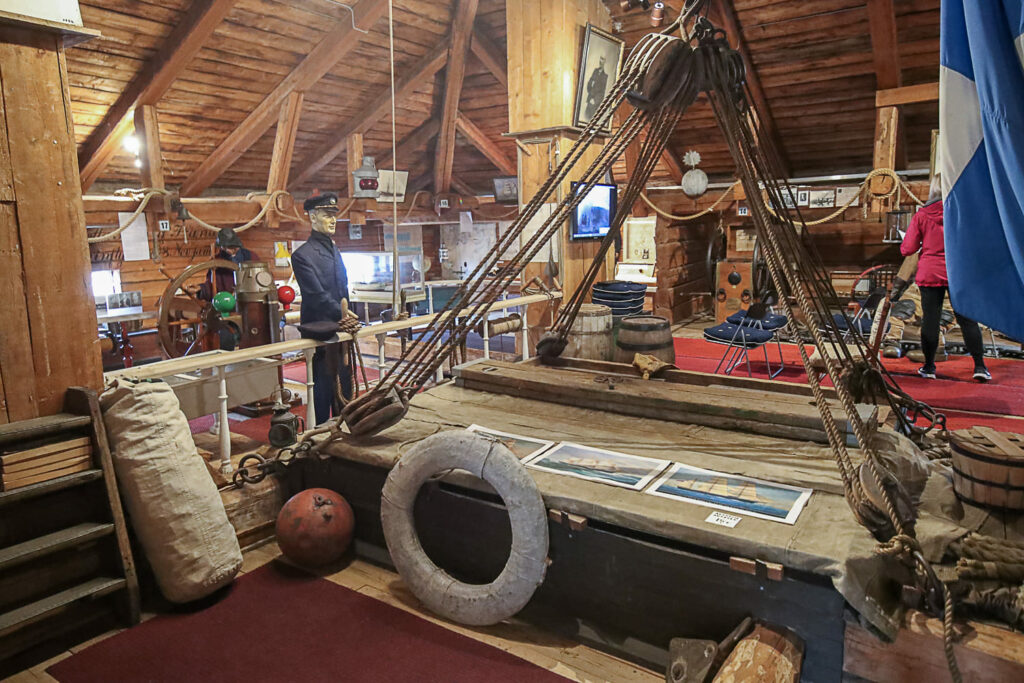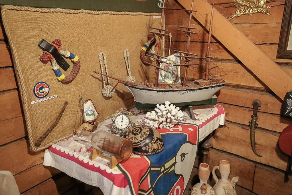 Yläkerran näyttelytila on rakennettu muistuttamaan merillä seilaavan purjeveneen kantta. Esillä on muun muassa ohjaamo ruoreineen, kapteenin hytti ja laivakeittiö. Osa tavaroista on Merihistorian yhdistyksen keräämiä ja huutokaupoista ostettuja. Paljon esineitä on tullut myös kaupunkilaisten lahjoittamina.