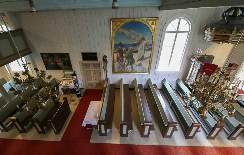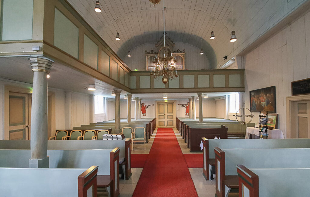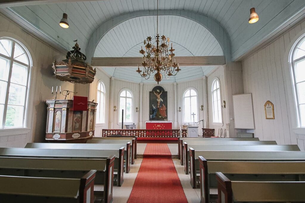Kirkkosali on koristeltu melko niukasti, mutta tyylikkään harkiten. Alttaritauluna kahden ison valoa antavan ikkunan välissä on Carl Fredrik Blomin maalaus Ristiinnaulittu vuodelta 1823. Teos toimi alun perinkin alttarimaalauksena, mutta sitä pidetiin välillä varastossa ennen palautusta paikalleen.