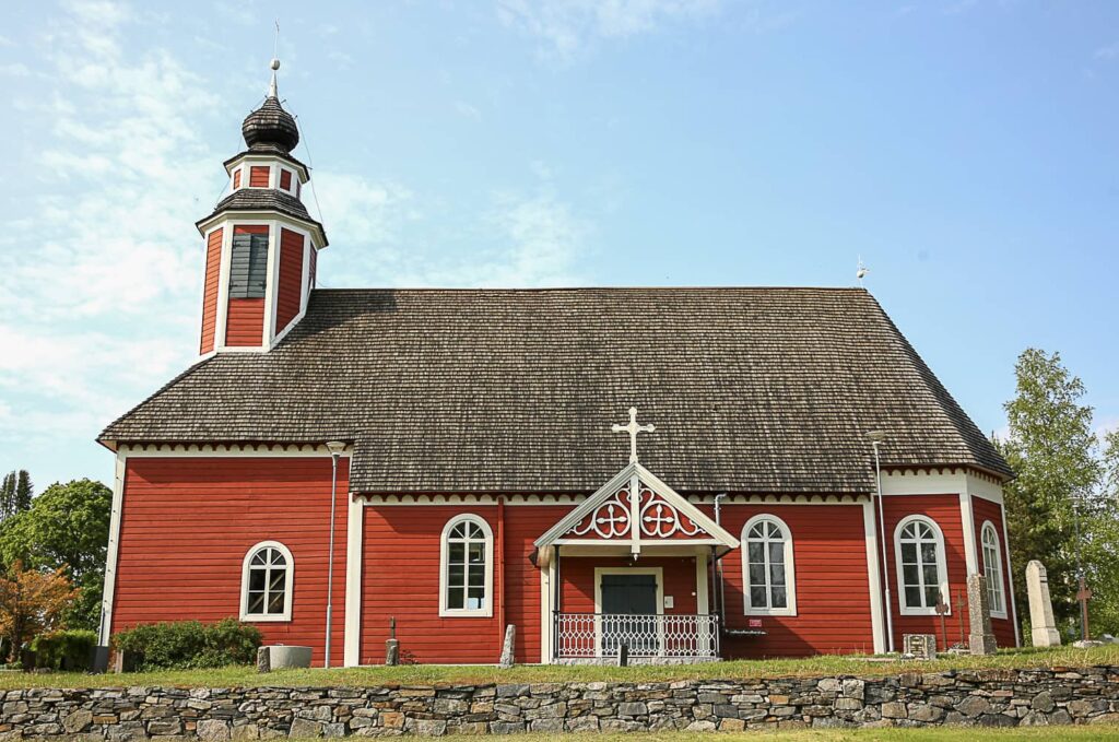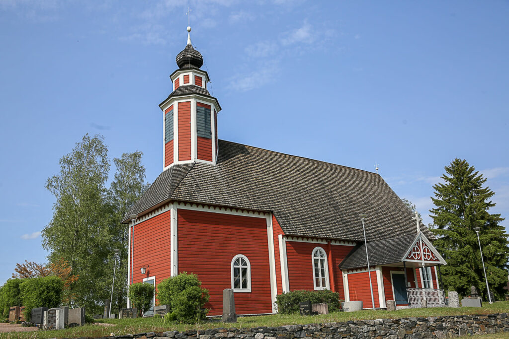 METSÄMAA (Loimaa) / VARSINAIS-SUOMI – Kaunis kesäinen päivä. Aurinko paistaa pilvettömältä siniseltä taivaalta. Kun tämä kaikki on taustana, Metsämaan kirkkaanpunaisena hohtava puukirkko idyllisine hautausmaineen on ilo silmälle.