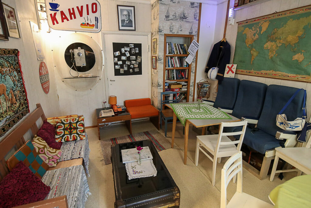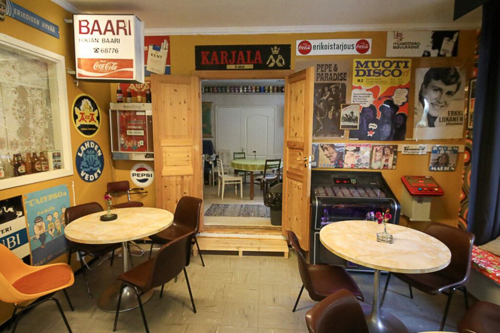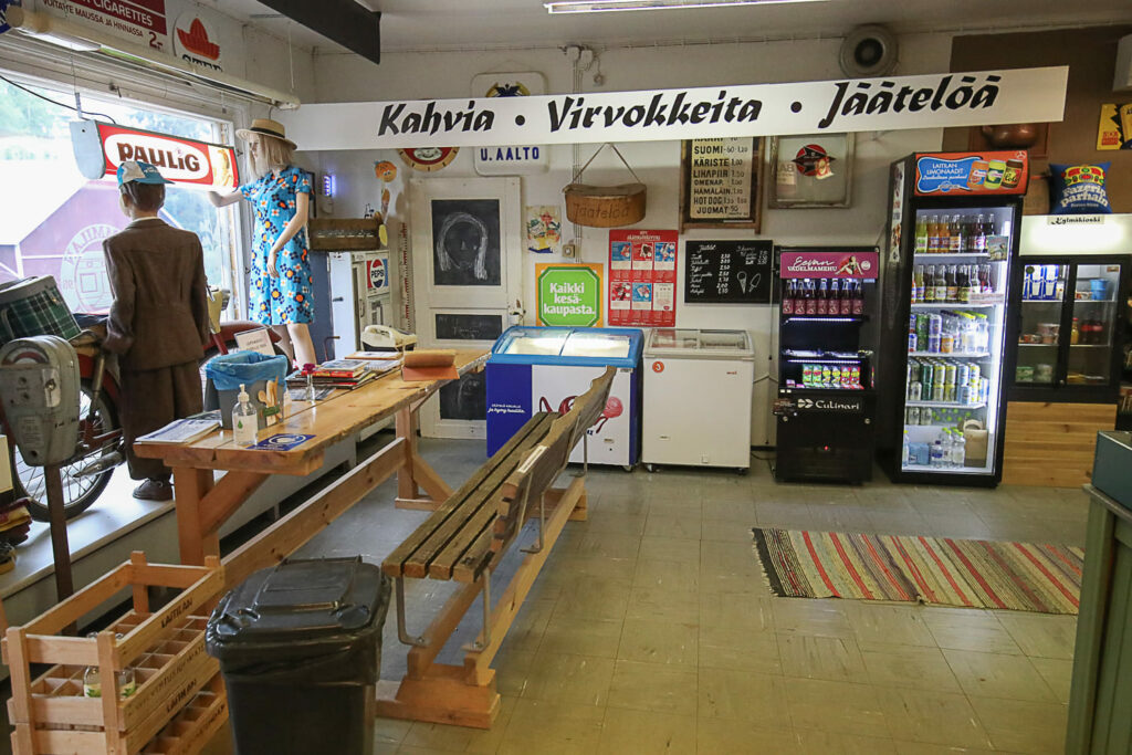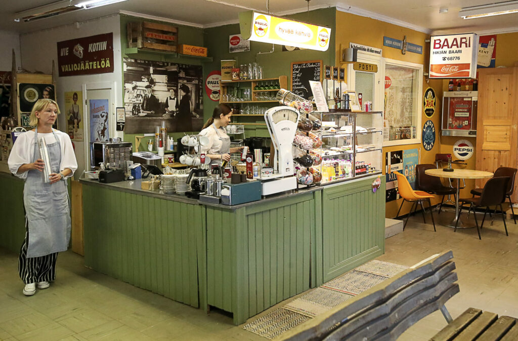 Hartikaisen kyläpuoti ei ole pelkkä kauppamuseo, vaan sen yhteydessä on nostalginen kahvilabaari. Kahvinsa voi nauttia mummokammarissa tai ulkoterassilla istuen ja samalla Mommilan maalaismaisemasta nauttien.