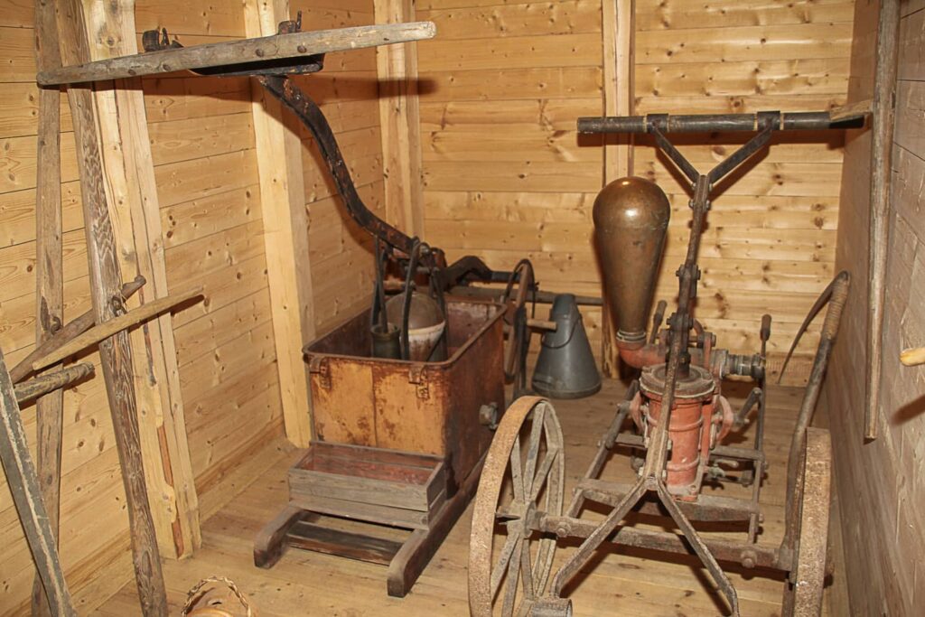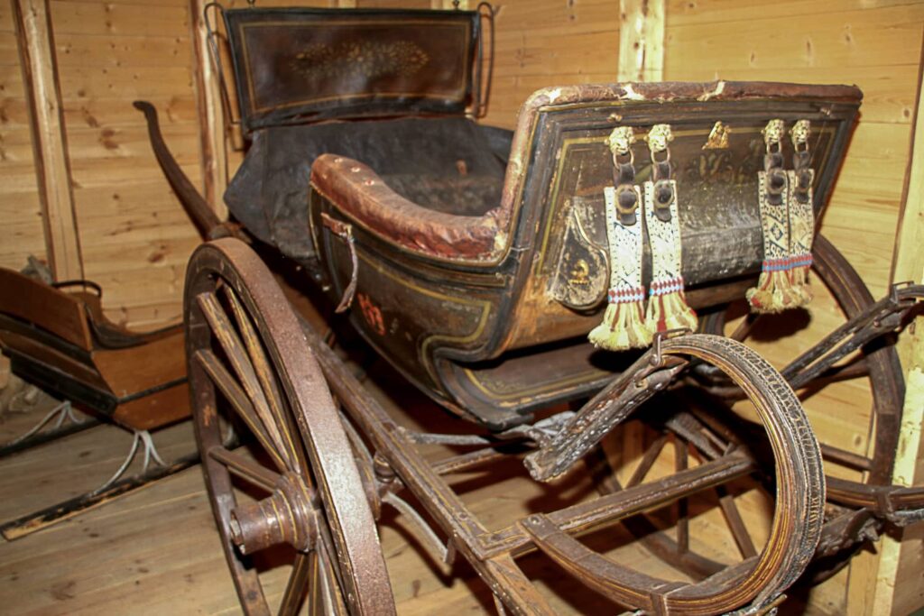 Sisätilojen näyttelyt kertovat 1800-luvun talonpoikaiselämästä. Nähtävänä on monipuolinen kokoelma vanhoja työkaluja, kotitaloustavaroita, kirkkosilkkejä ja palotorjuntakalustoa. Eräs erikoisuus on arvokkaat hevosten vetämät kiesit. Ajopeli on koristeltu kullanvärisillä leijonanpäillä.