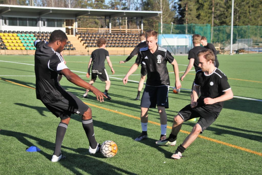 Camoon! One more! Try hard! Portugalilainen valmentaja Diogo Nobre käskyttää pelaajiaan. Sauvon HakkisPaanalla on futisharjoituksissa...