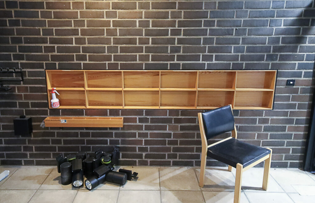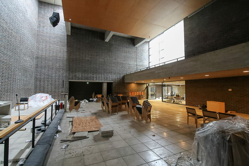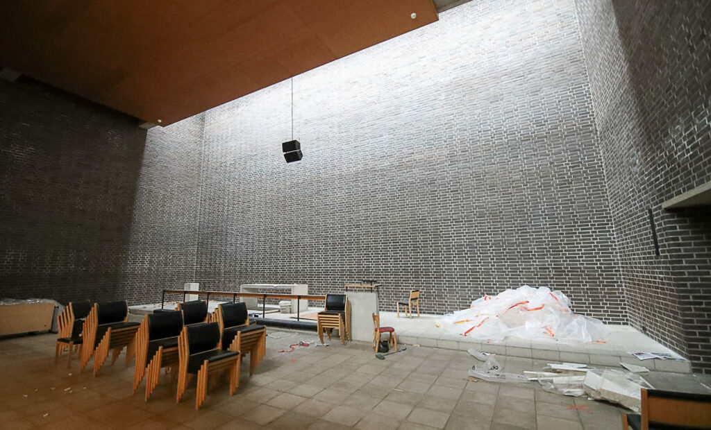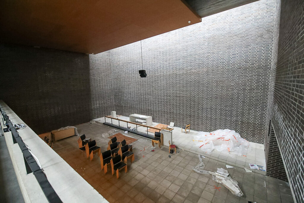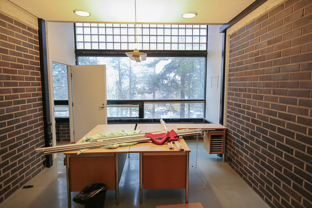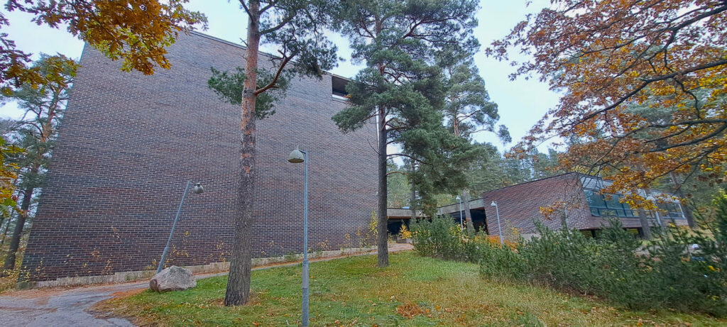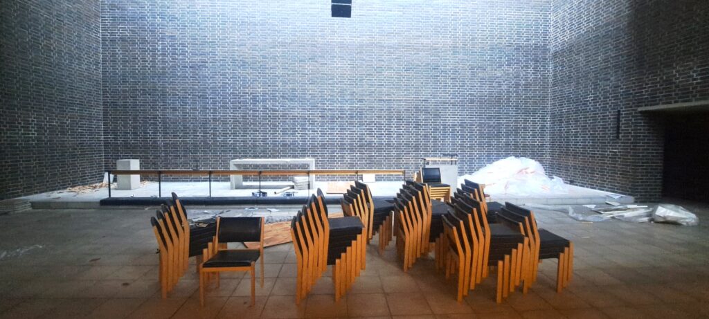 Pallivahan seurakuntakeskuksessakin betoni oli isossa roolissa, mutta yleisilme korostuu tummaksi poltetusta tiilipinnasta. Sitä löytyi niin ulkoa kuin sisältäkin.