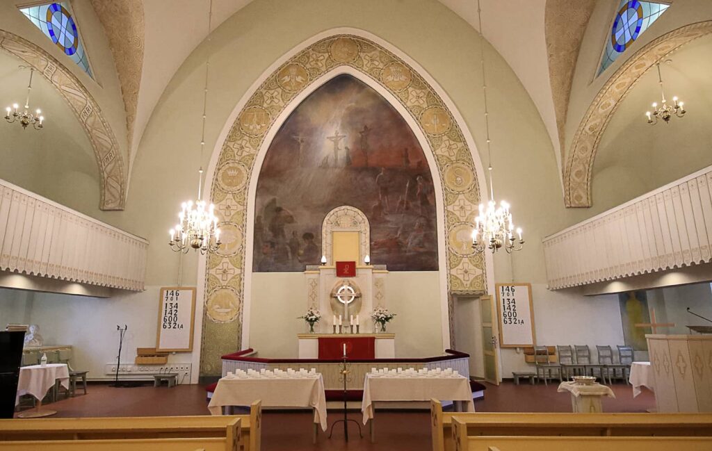 Hillitysti koristellun kirkkosalin erikoisuus on arkkitehti Launiksen maalaama kookas alttarifresko, joka kuvaa Jeesuksen kuolinhetkeä ristillä. Sekin on melkoinen taidonnäyte sen tekijältä, joka oli silloin vasta nuori arkkitehtiylioppilas.