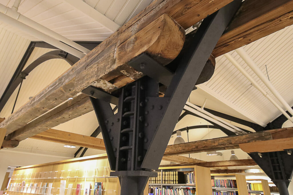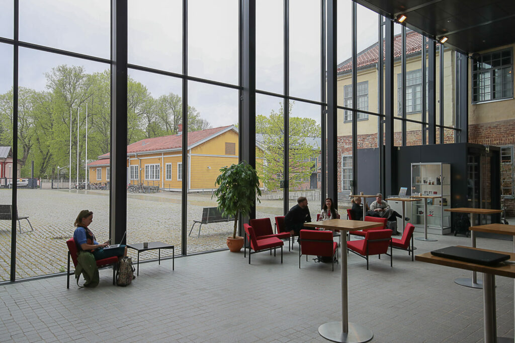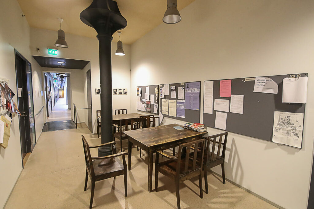 Sisätiloissa korostuu selkeys ja yksinkertaisuus sekä pelkistetty väritys. Mustaa, harmaata ja valkoista on elävöitetty puupinnoilla. Lattiat ovat betonia. Alkuperäiset hirsi- ja rautapalkit on jätetty näkyviin. Parhaimmillaan tämä näkyy tiedekunnan kirjastossa, missä valkoisten kattopaneelien seassa risteilevät mustat rautapalkit ja ajan patinoimat hirret.