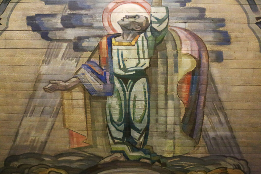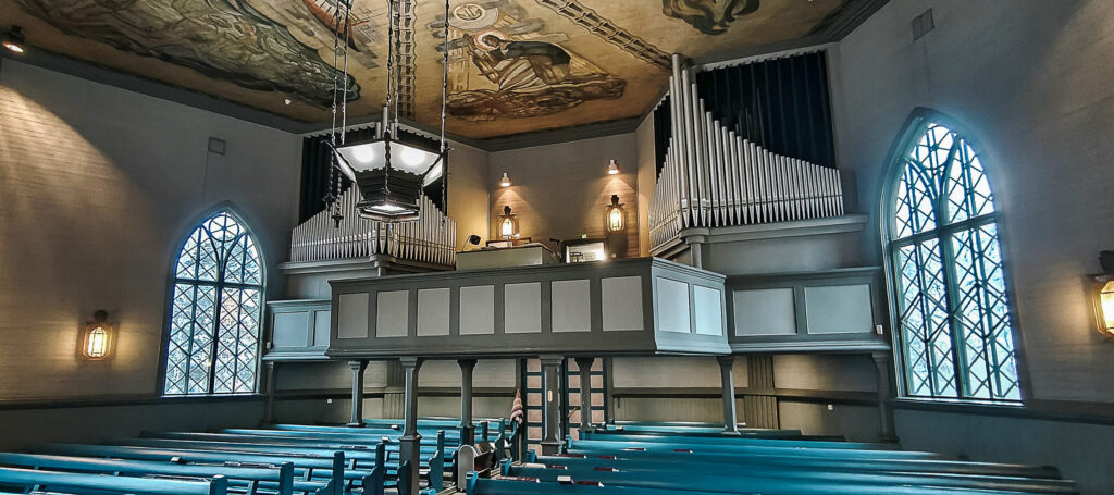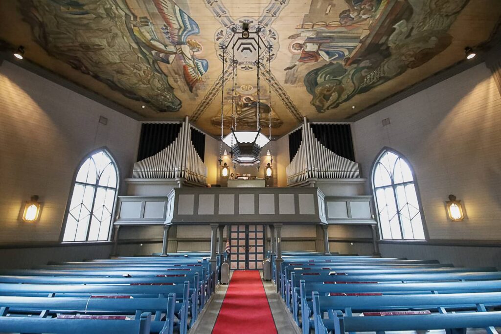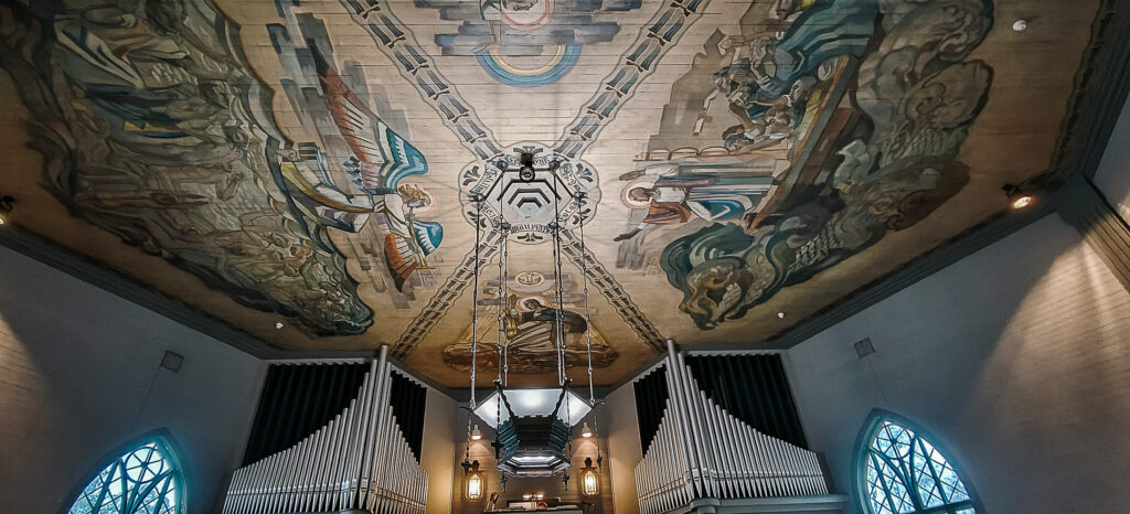 Ensikertaa kirkossa vierailevan niskalihakset ovatkin koetuksella, nimittäin sen verran hienot ja värikkäät ovat poikkeukselliset kattomaalaukset.