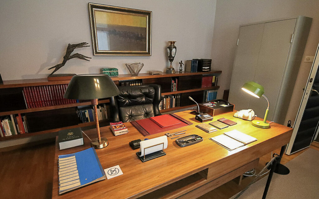 Työhuoneen ovi on äänieristetty ja ikkunoissa on luodinkestävät lasit. Pöydällä on Kekkosen aikainen kalenteri. Siihen presidentti on kirjannut erään torstain päivän kohdalle: Valtiopäivien avajaiset. Seuraavan päivän kohdalle on kirjoitettu: Kalastamaan Brasiliaan.