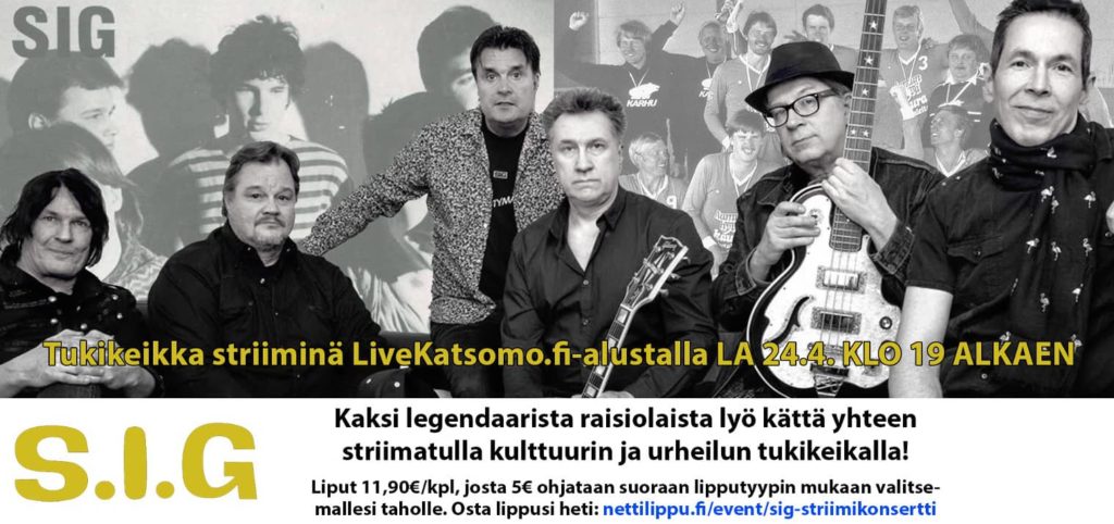– S.I.G ei ole poikkeusaikana päässyt keikoille, joten piti keksiä jotain sellaista, missä olisi kiinnostava päämäärä. Turkulainen RajuLive, jolla on kokemusta useiden konserttien striimausten toteuttamisesta, ehdotti meillekin sellaista. Jos teemme konsertin, bändin pitää saada myös yleisöä. Päätimme ottaa urheiluseuroja mukaan, sillä niiden toiminnassa on paljon tuttujani mukana. Ja onhan urheiluseuroillakin näinä aikoina samat taloudelliset ongelmat, kertoo bändin kosketinsoittaja Oksanen striimikeikan ideoinnista.