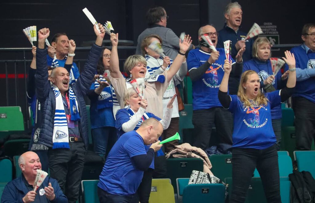 Vieraiden kannattajajoukko jaksoi kannustaa omaa joukkuettaan läpi koko ottelun. Tuton otteluissa jostain syystä molemmat katsomonosat ovat avoinna yleisölle. Väkeä on lehtereillä enemmän kuin TV-kuvasta voisi päätellä.
