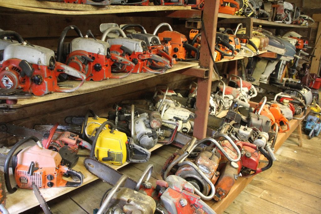 Mauno Räsänen on vuosien varrella kerännyt myös kaikenlaisia metsurikulttuuriin kuuluvaa esineistöä. Vanhan ajan pokasahat ovat saaneet seurakseen kymmenet moottorisahat.
